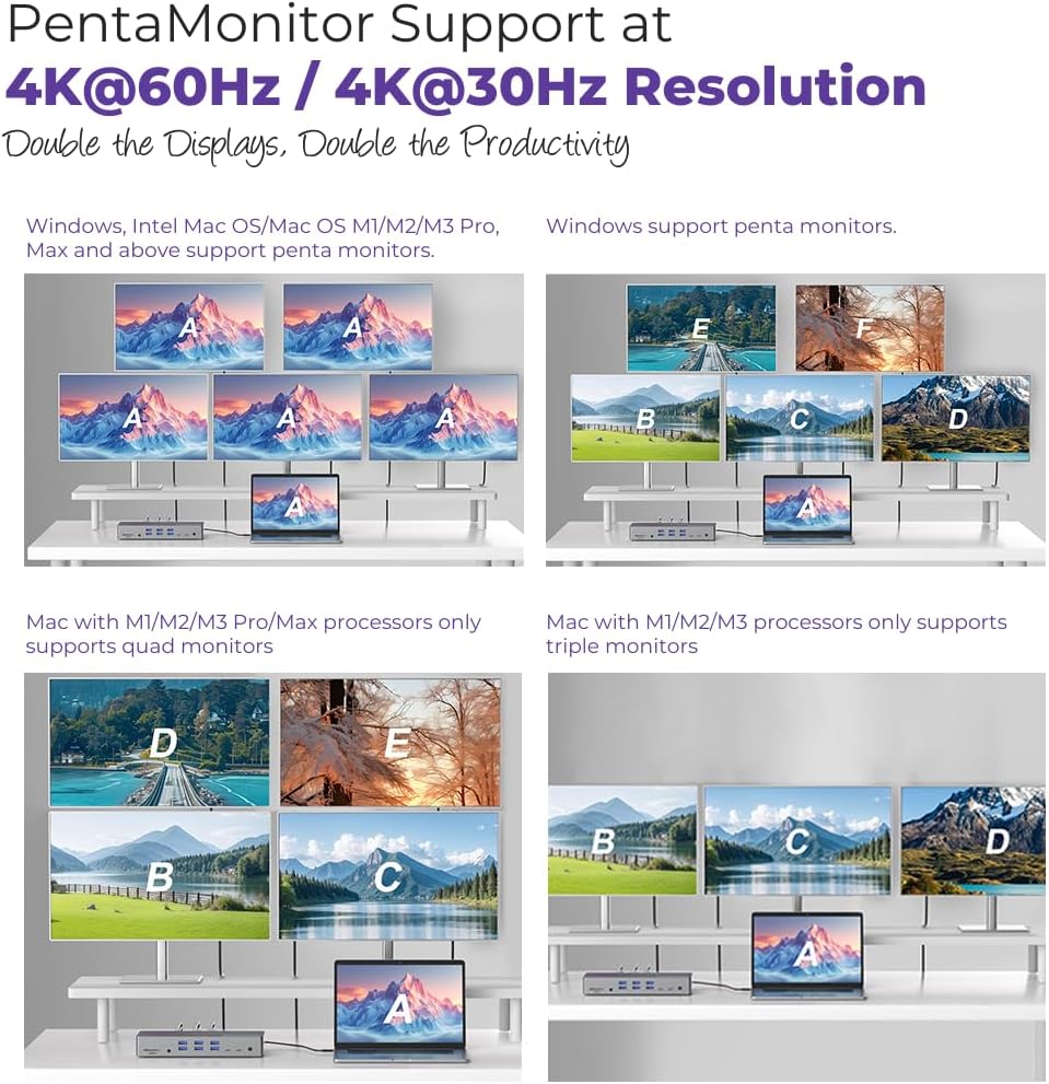 - [First Penta Monitor Dock] – Supports upto 5x 4K @ 60Hz or 1x 8K @ 60Hz. Windows: 5 displays (Mirror/Extended). Mac M1/M2/M3: 4 (Mirror), 3 (Extended). M1/M2/M3 Pro & Max: 5 (Mirror), 4 (Extended) via DisplayLink.