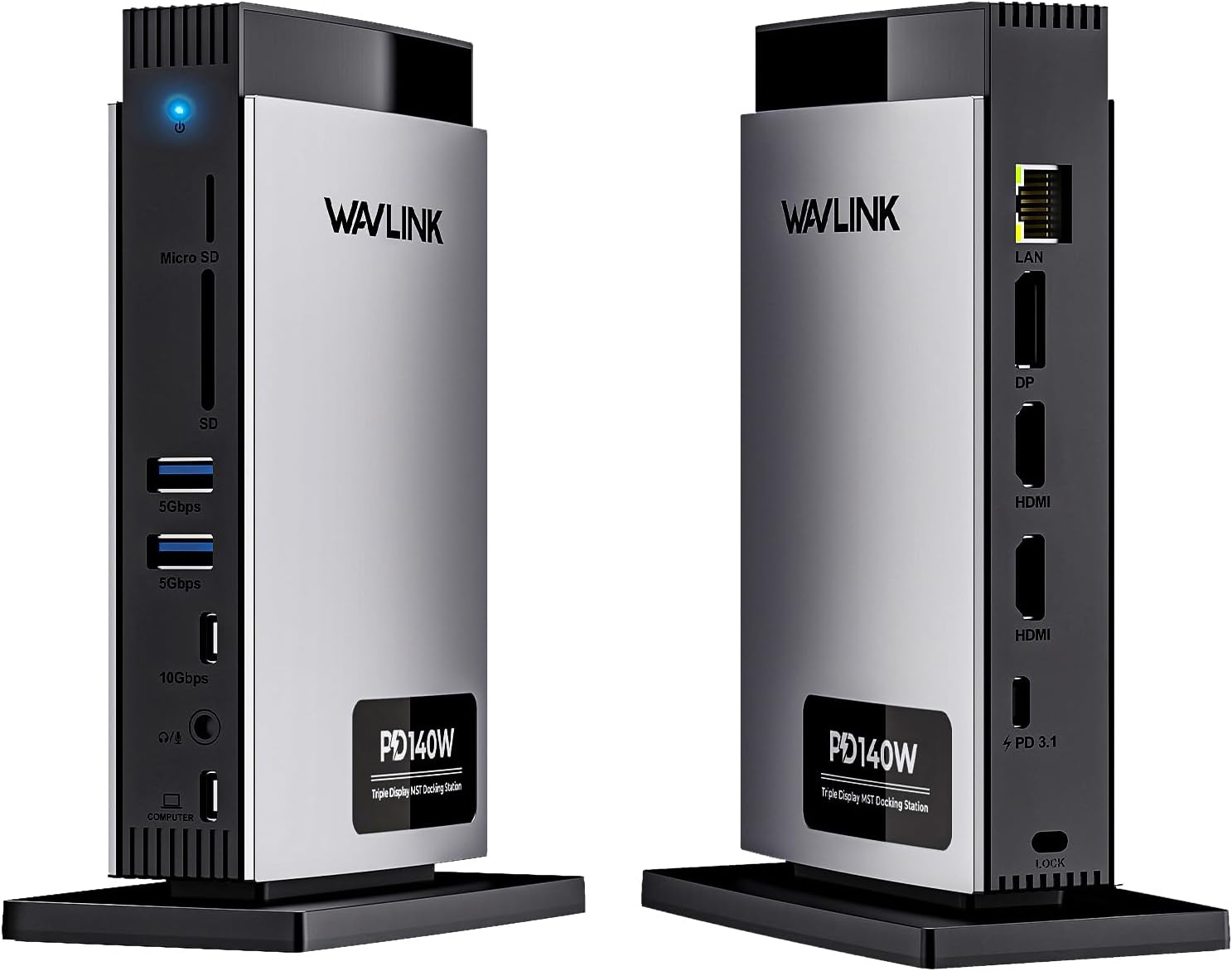 - 【11-in-1 Laptop Docking Station】The WAVLINK multi-port USB C dock includes a 140W PD3.1 USB-C input, 2 * 8K HDMI, 8K DP, USB-C (Host, PD125W), 10Gbps USB-C 3.2, 2 * 5Gbps USB-A ports, an 104MB/s SD/Micro SD card reader , a 1000Mbps RJ45 Ethernet port, and a TRRS 4-pole phone jack