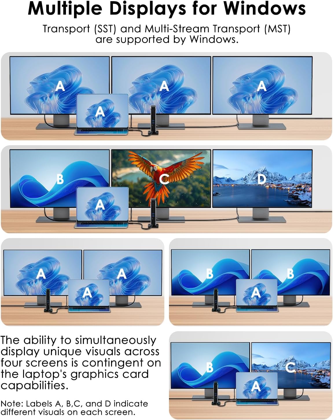 - 【Note Before Purchase】Simply Plug & Play, no external drivers required. MacOS-based computers do not support MST, only extend to one different screen (ABBB). Some Windows laptops may only support 3 monitors(including the host screen) due to their graphic card limitations. Your USB-C phones/tablets should support the OTG function. The type-C port of your host should support video output to enjoy the full function of this docking station. It is only compatible with MacBook models from 2018 and later