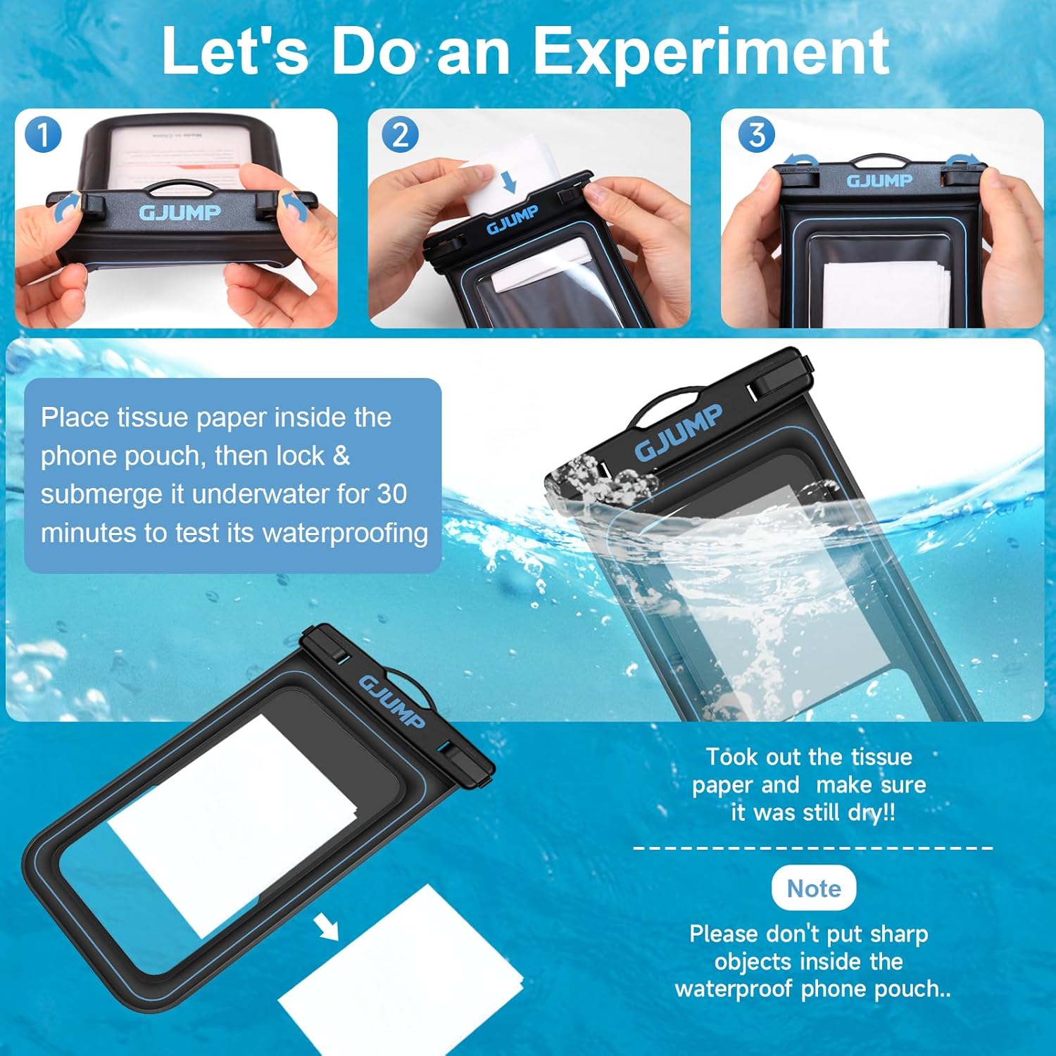 - 🛡️ IP68 Waterproof Durability: GJUMP's Floating Waterproof Phone Case is equipped with IP68-rated waterproof technology and a triple-layer secure sealing system, meaning it offers superior protection against water, dust, and dirt. It can withstand being submerged up to 2 meters (6.6 feet) in water for up to 30 minutes—ideal for a wide range of aquatic activities, including swimming, kayaking, and snorkeling. Your phone will stay safe and dry no matter how wet things get.