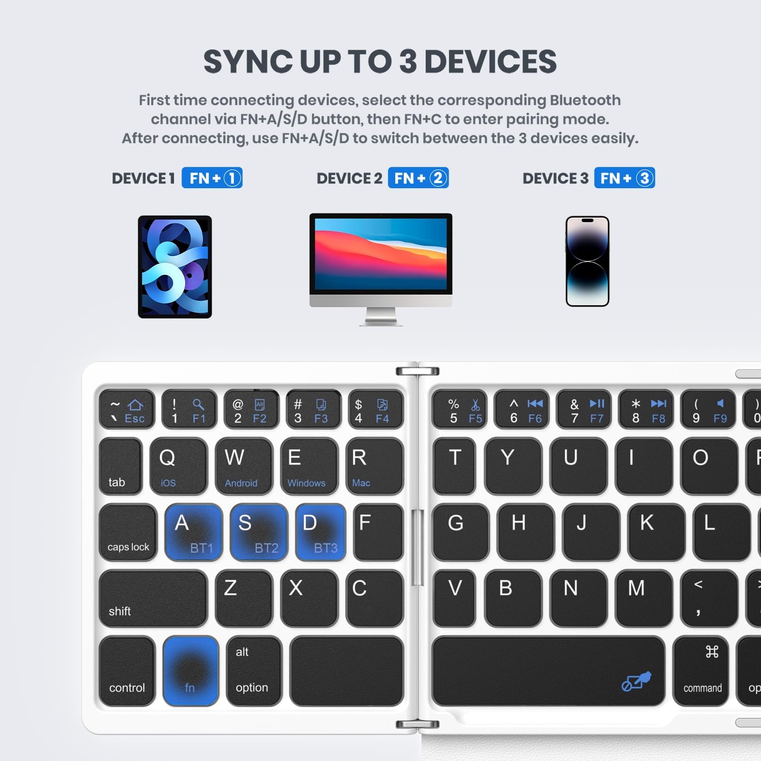 - 【Triple-Folding Portable Bluetooth Keyboard】Fold it in slide into your work bag or simply stash in your carry-on for business trips. Wherever work takes you, enjoy familiar desktop-style typing on bluetooth keyboard with number pad and a touchpad surface 20% larger than previous models. Navigate screens and multitask efficiently without packing a separate mouse