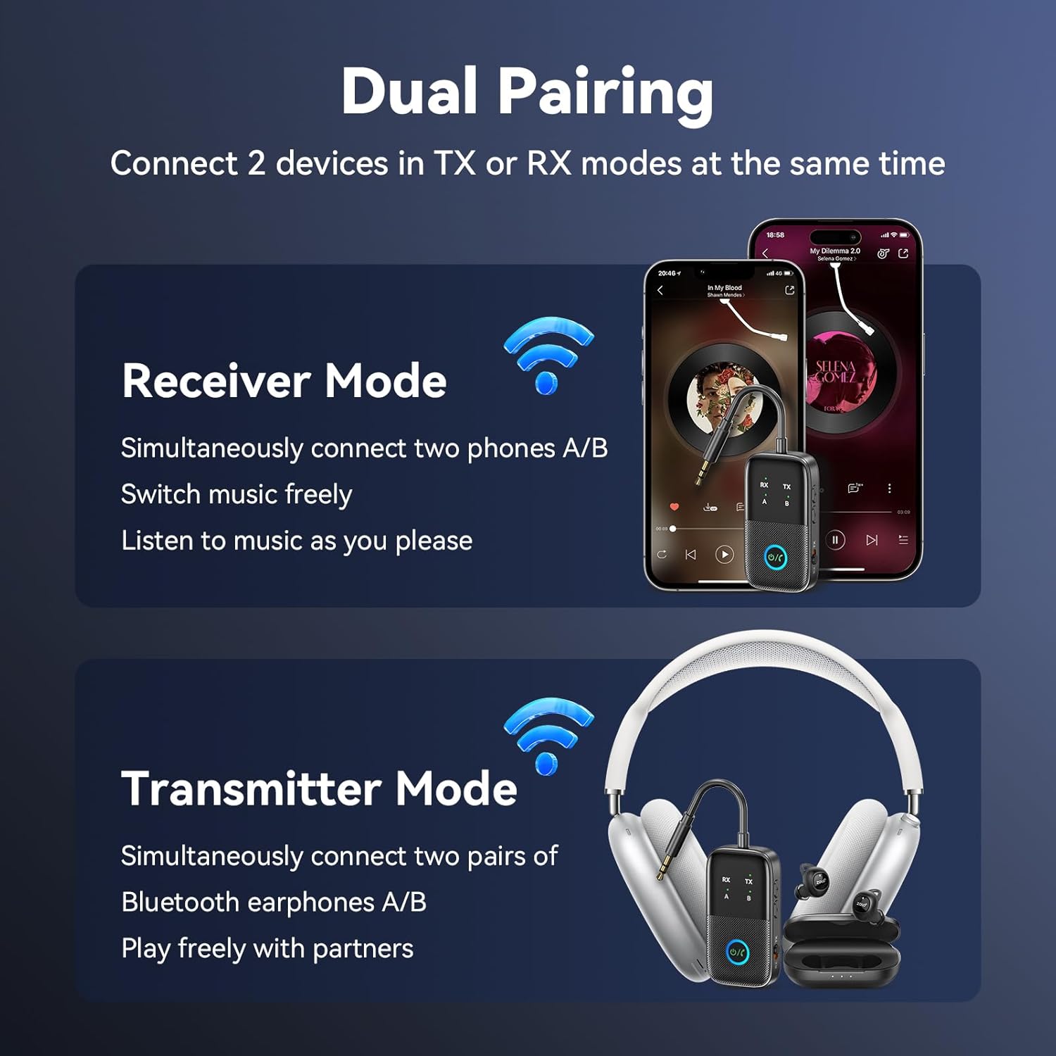 - 2-in-1 Transmitter Receiver:The device supports both transmit and receive modes. In TX mode, the Bluetooth transmitter connects non-Bluetooth audio sources (such as airplanes, TVs, or MP3 players) to Bluetooth-enabled speakers and headphones via a 3.5mm (AUX/RCA) cable. In RX mode, the Bluetooth receiver receives audio from a smartphone or other Bluetooth-enabled audio source device and then transmits the audio over a 3.5 mm AUX cable to non-Bluetooth wired speakers, car/home stereos