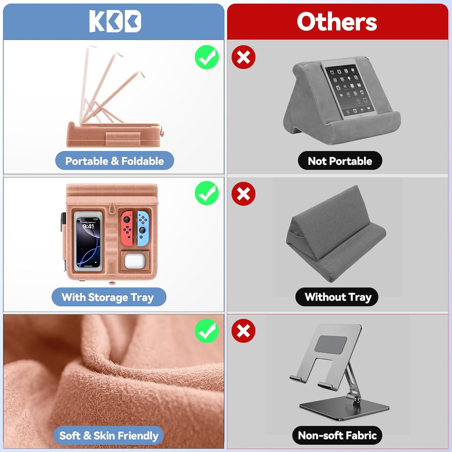 - Flexible Angle Adjustment and Stability - The tablet pillow holder has 3 adjustable angles to ensure you can easily adjust the angle and multi-angle adjustment. Whether you are on the sofa, bed or table, it provides the best viewing angle, KDD soft pillow tablet stand frees your hands and relieves neck fatigue.
