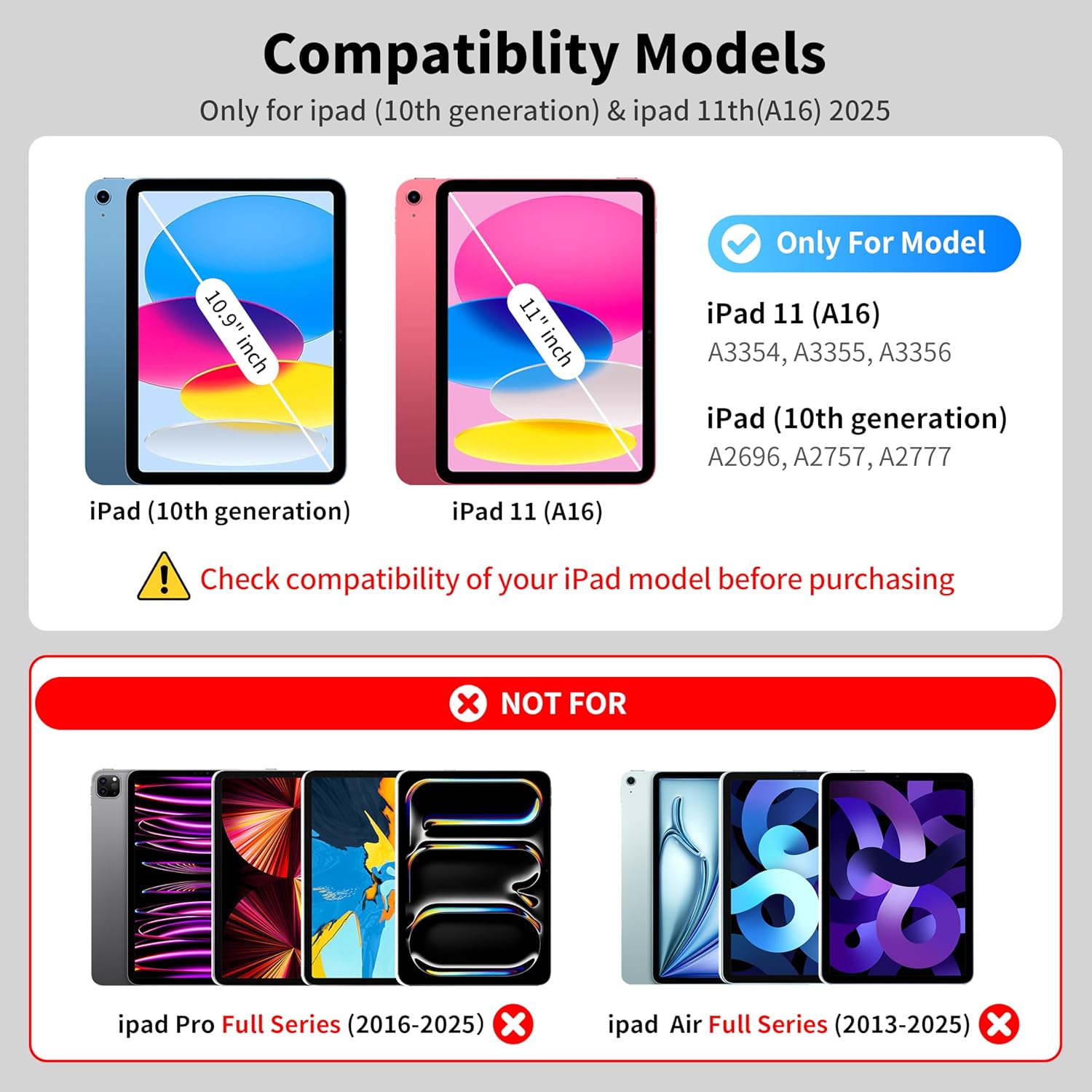 - 【Only compatible】This multi-functional magic keyboard case is only compatible with iPad 11 (A16) Model: A3354, A3355, A3356 and iPad (10th generation) Model: A2696, A2757, A2777. Note: Incompatible with other iPad models. Please check the model on the back of the iPad before purchasing to ensure a perfect match