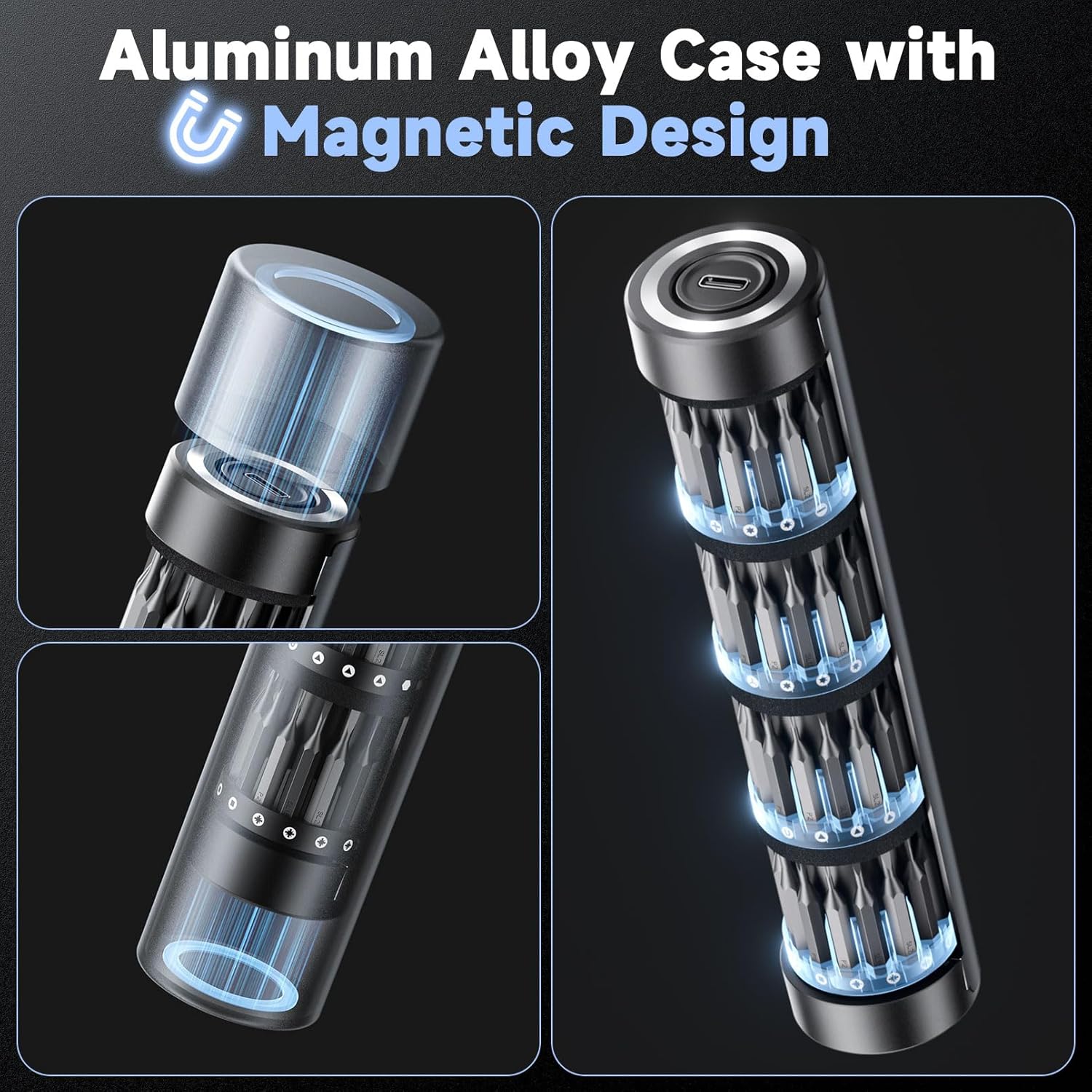 - Full Magnetic & Organized: This small screwdriver set features a spring-loaded pop-up design for instant one-handed access, a durable aluminum alloy body balancing strength and weight, and a rotating bit storage compartment keeps tools organized and ready by magnetic force, making operation more enjoyable.