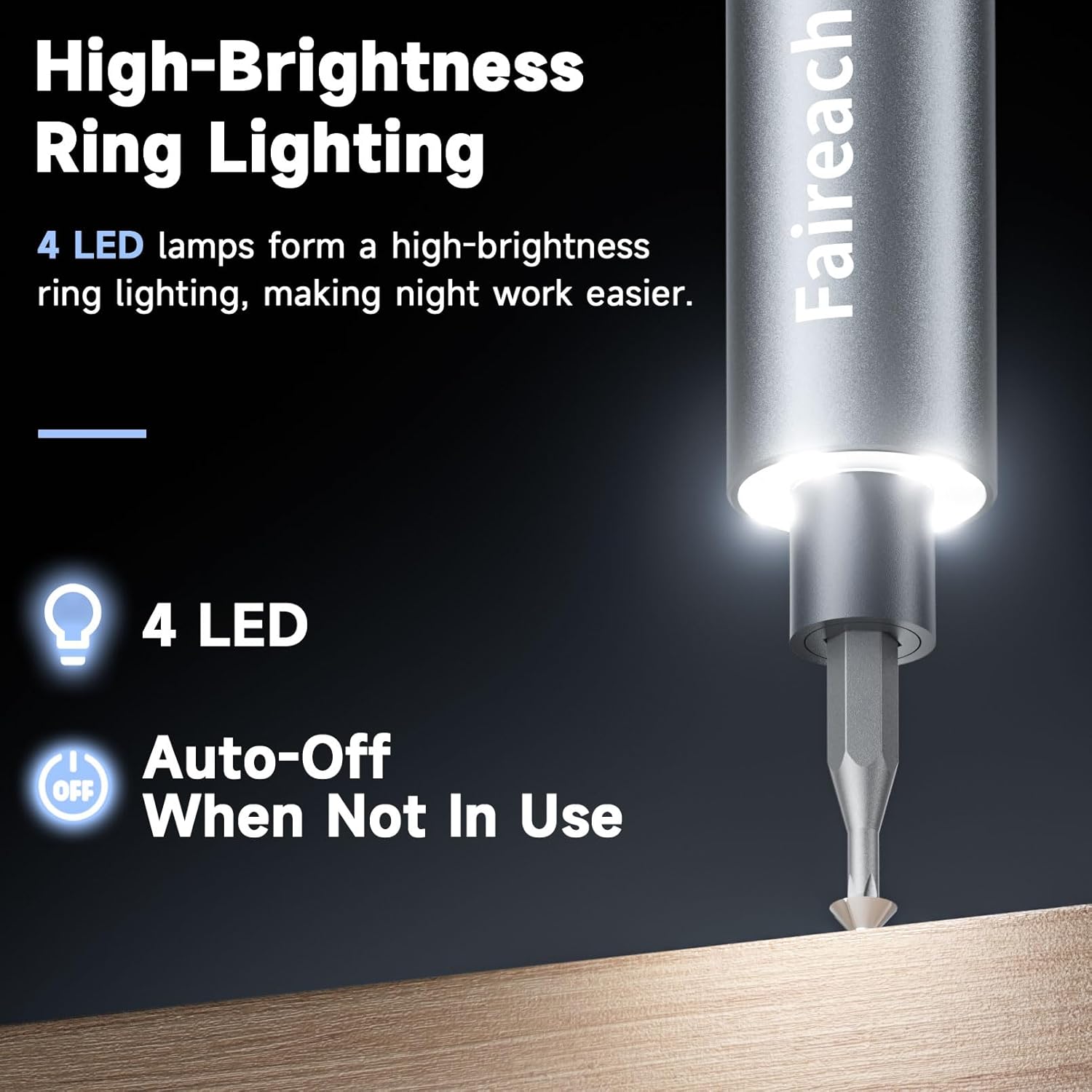 - Engineered for Precision & Power: With 3 gear torque adjustment (0.15/0.25/0.35 N.m) and a 180RPM high-speed motor, the Faireach electric screwdriver cordless makes precision repairs effortless. For heavy-duty tasks, Manual Mode delivers 3N.m of torque. The OLED smart display keeps you informed with battery status, torque setting, and real-time performance metrics—ensuring accuracy and control for any project.