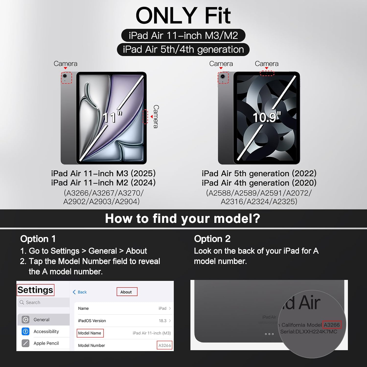 - [Compatibility] NOT for iPad (A16) 11th/10th Generation (2025/2022). Snugly fit for iPad Air 11-inch M3/M2 (2025/2024), iPad Air 5/4 (2022/2020 5th/4th generation 10.9-inch). Fit iPad Models: A3266 / A3267 / A3270 / A2902 / A2903 / A2904 / A2588 / A2589 / A2591 / A2324 / A2072 / A2316 / A2325. Please Go to Settings > General > About, then tap the Model Number field to reveal the A model number