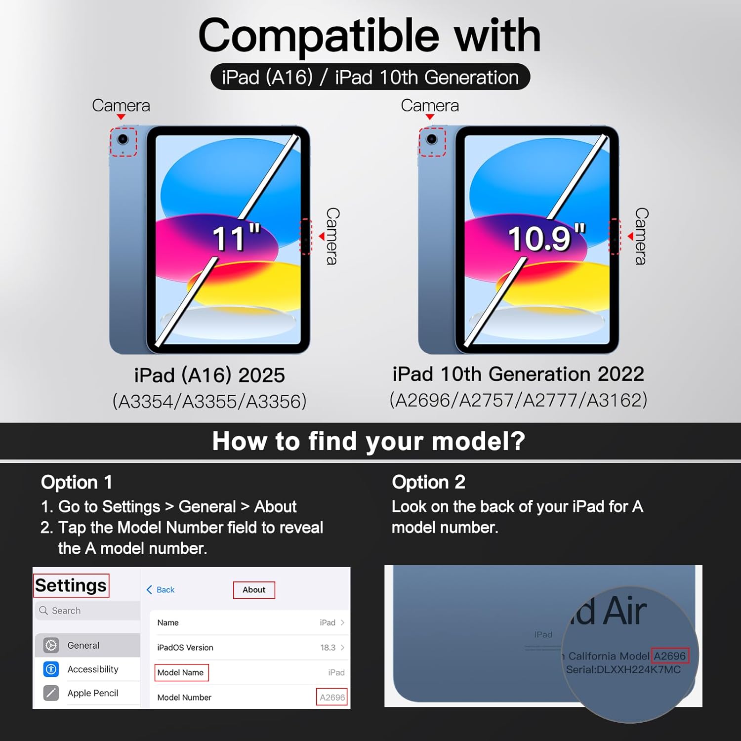 - [Compatibility] Snugly fit for iPad (A16) 11th/10th Generation (2025/2022). Fit iPad Models: A3354 / A3355 / A3356 / A2696 / A2757 / A2777 / A3162. Please Go to Settings > General > About, then tap the Model Number field to reveal the A model number