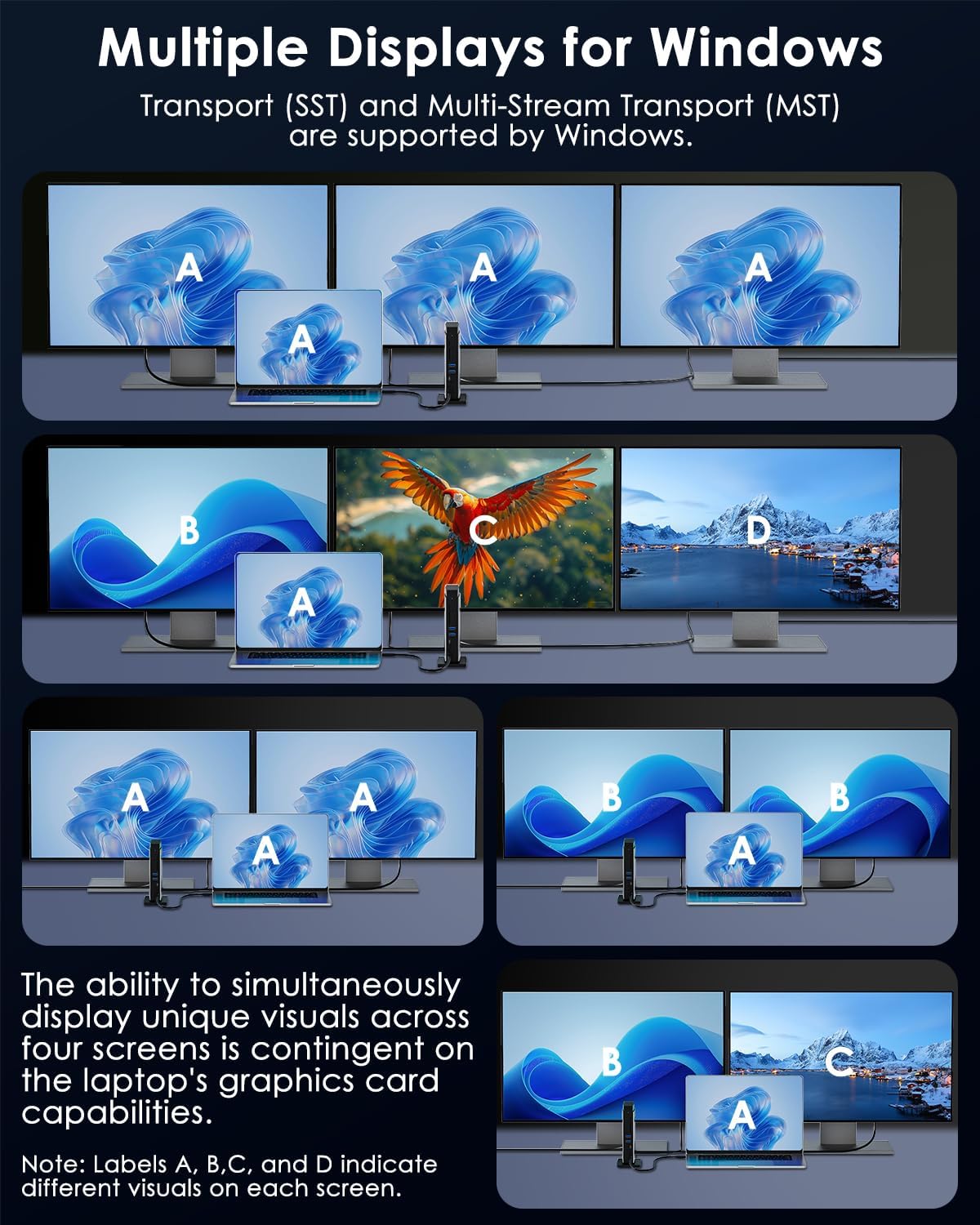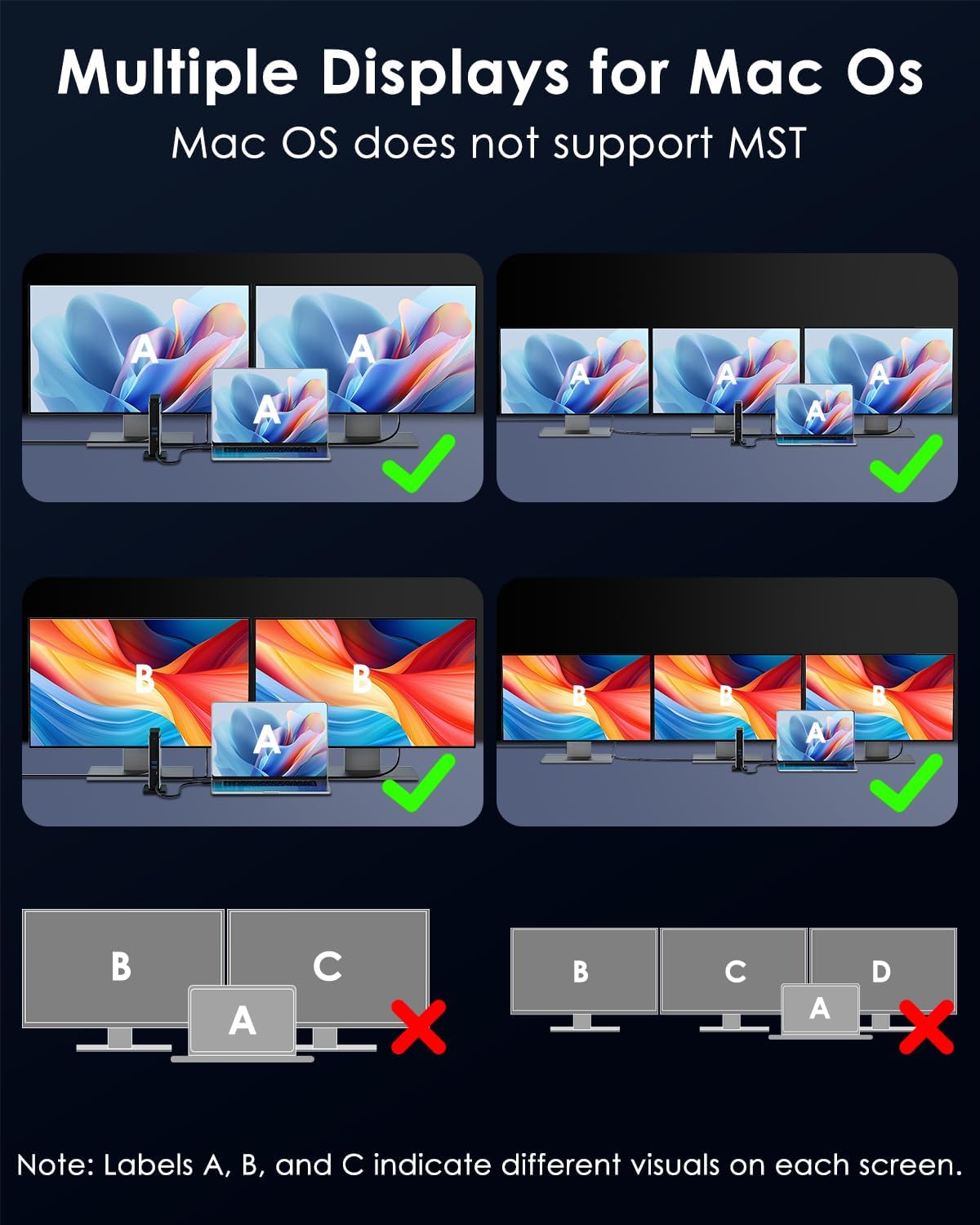 - 【Note Before Purchase】Simply Plug & Play, no external drivers required. MacOS-based computers do not support MST, only extend to one different screen (ABBB). Some Windows laptops may only support 3 monitors(including the host screen) due to their graphic card limitations. Your USB-C phones/tablets should support the OTG function. The type-C port of your host should support video output to enjoy the full function of this docking station. It is only compatible with MacBook models from 2018 and later