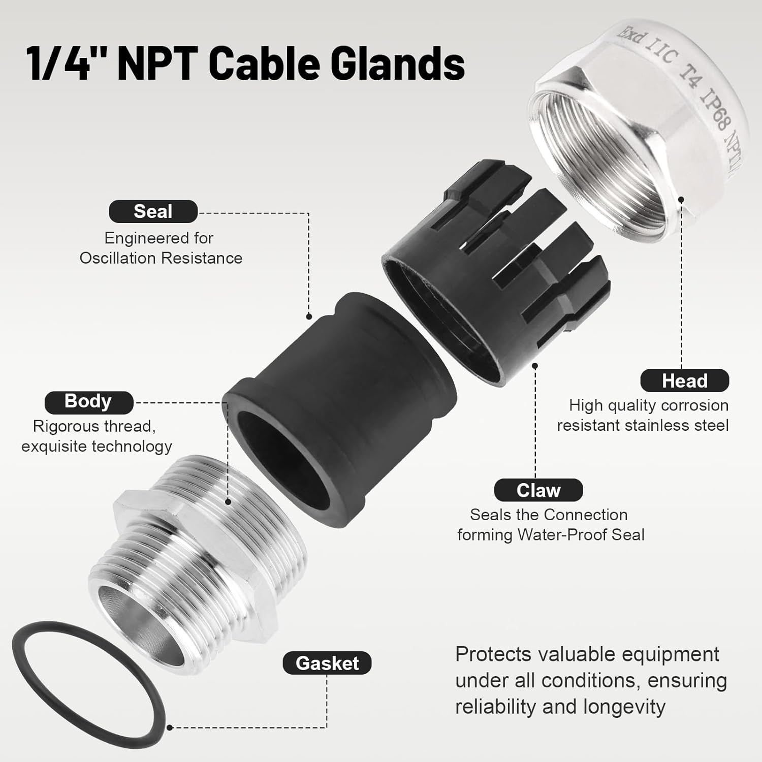 - Quality Materials: These 1/4" cable gland are made of 304 stainless steel for superior reliability and to withstand harsh environments that plastic glands cannot