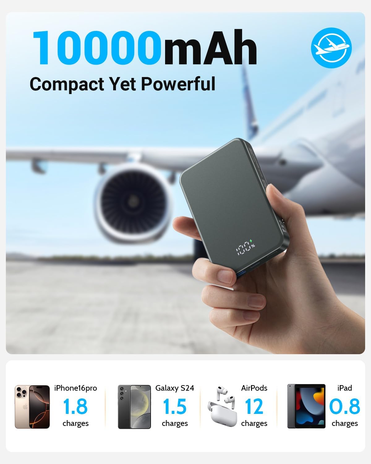 - 【Compact and powerful】POAQCIF 10000mAh slim magnetic portable charger is only 4*2.6*0.6 inch and weighs only 187g, Designed for people who are always on the go.Equipped with lithium-ion with higher energy density and better safety features, which makes the power bank more compact but with higher capacity.Upgrade your mobile charging experience!