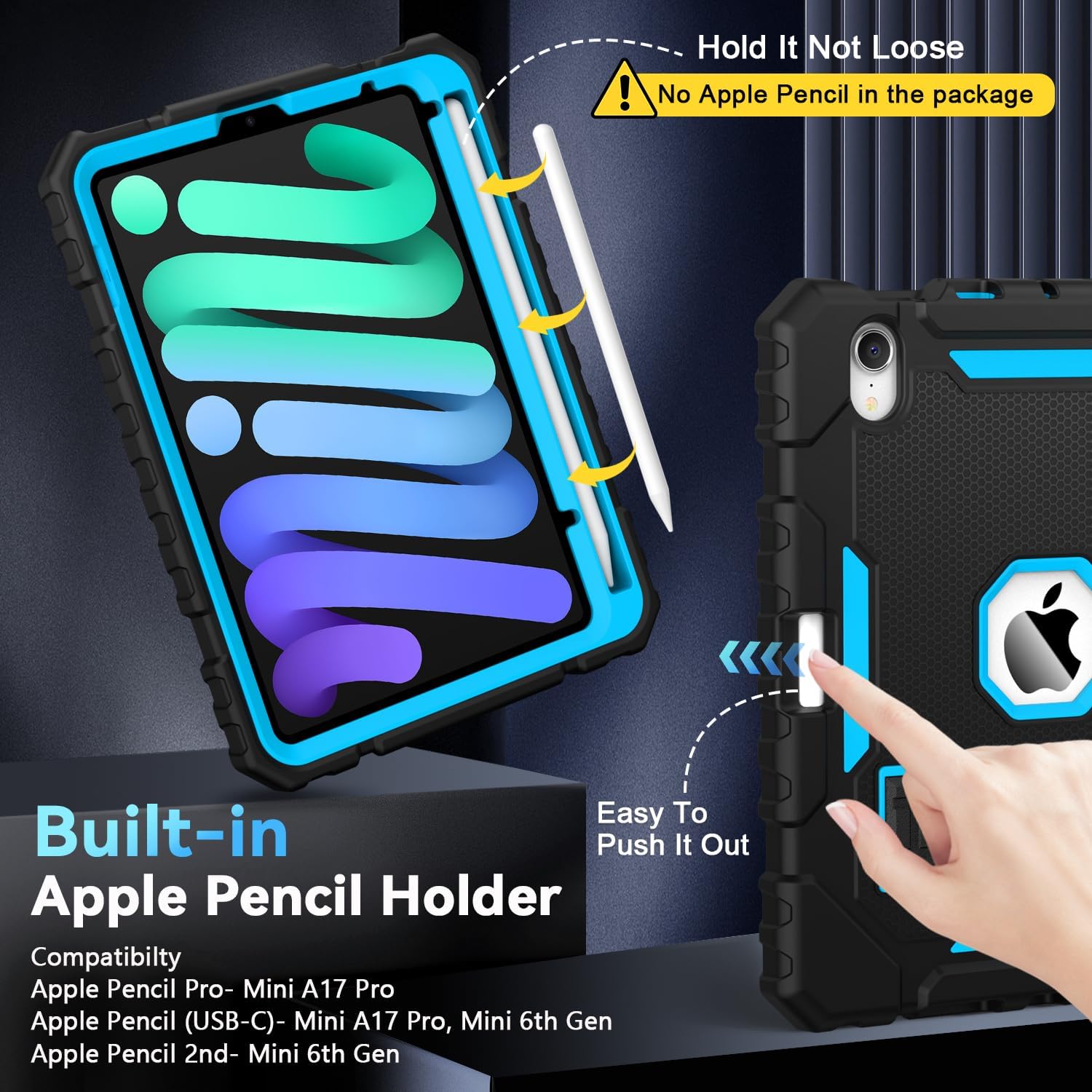 - [Built-in Apple Pencil Holder]- Built-in Slot, keep the Pencil not loose. Store it or take it out within 1 second. Support Apple Pencil (USB-C) and 2nd Gen Apple Pencil for iPad mini 6th (A15 Bionic). Support Apple Pencil (USB-C) and Apple Pencil Pro for iPad mini 7 (A17 Pro)