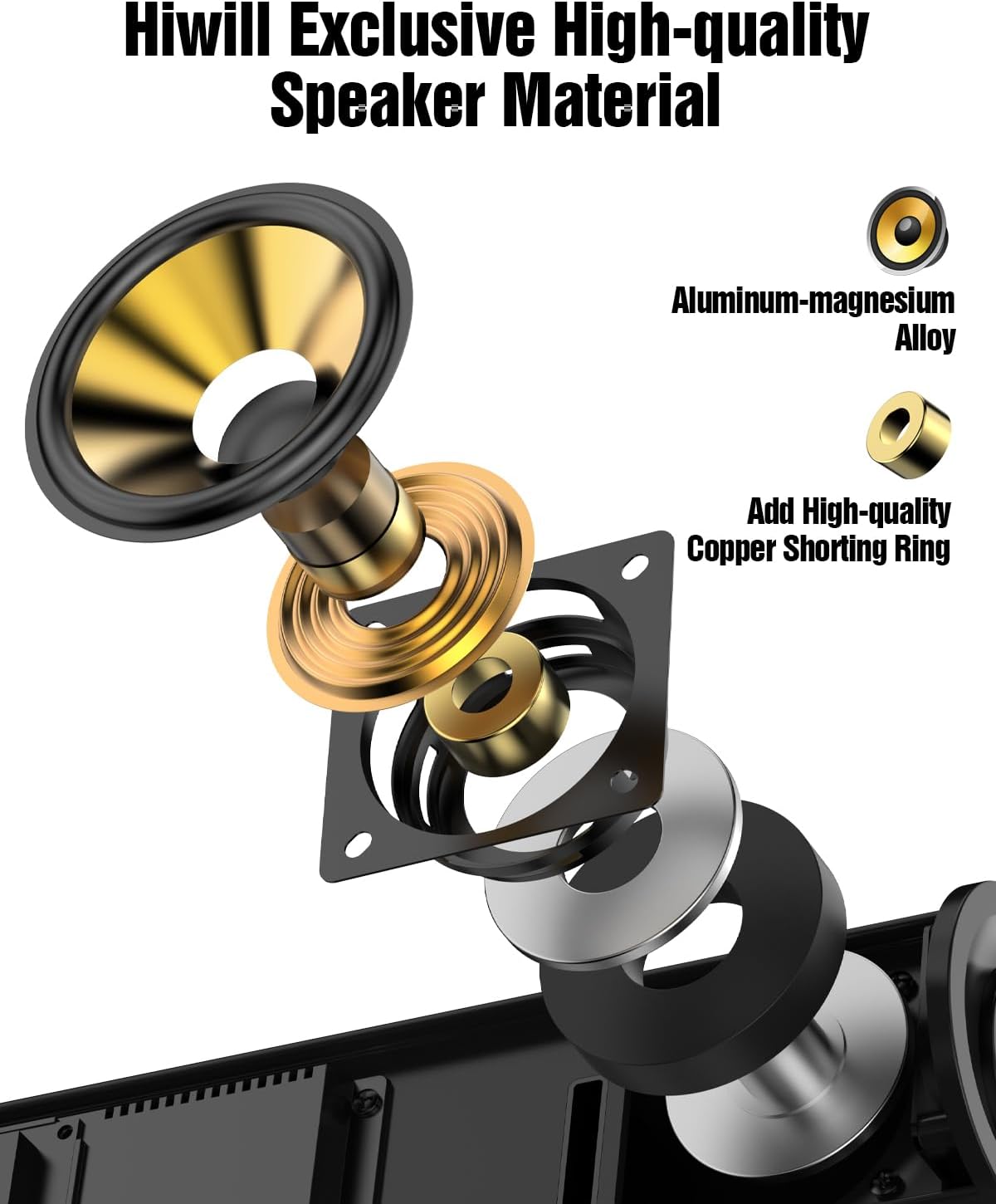- Additional lconic Copper Ring — Hiwill TV sound bar specifically incorporates a high-quality copper ring into each driver compared to the ordinary soundbar with subwoofer. By reducing distortion and stabilizing the magnetic field, this innovation delivers crisper highs, and a wider dynamic range, ensuring a balanced and precise sound profile. Step into an auditory voyage of unparalleled depth, from subtle nuances to explosive dynamics. Transform your listening space into a cinematic wonderland.