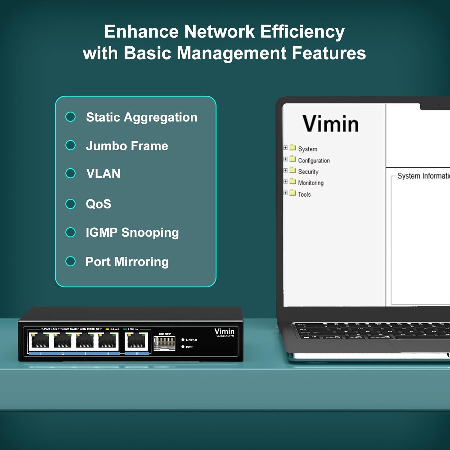 - 🛡️5x2.5G RJ45 Port & 1x 10G SFP Port: The vimin 2.5G managed switch features 5 adaptive 2.5G RJ45 ports and 1x 10G SFP+ port, providing a flexible range of connection options for growing enterprises.