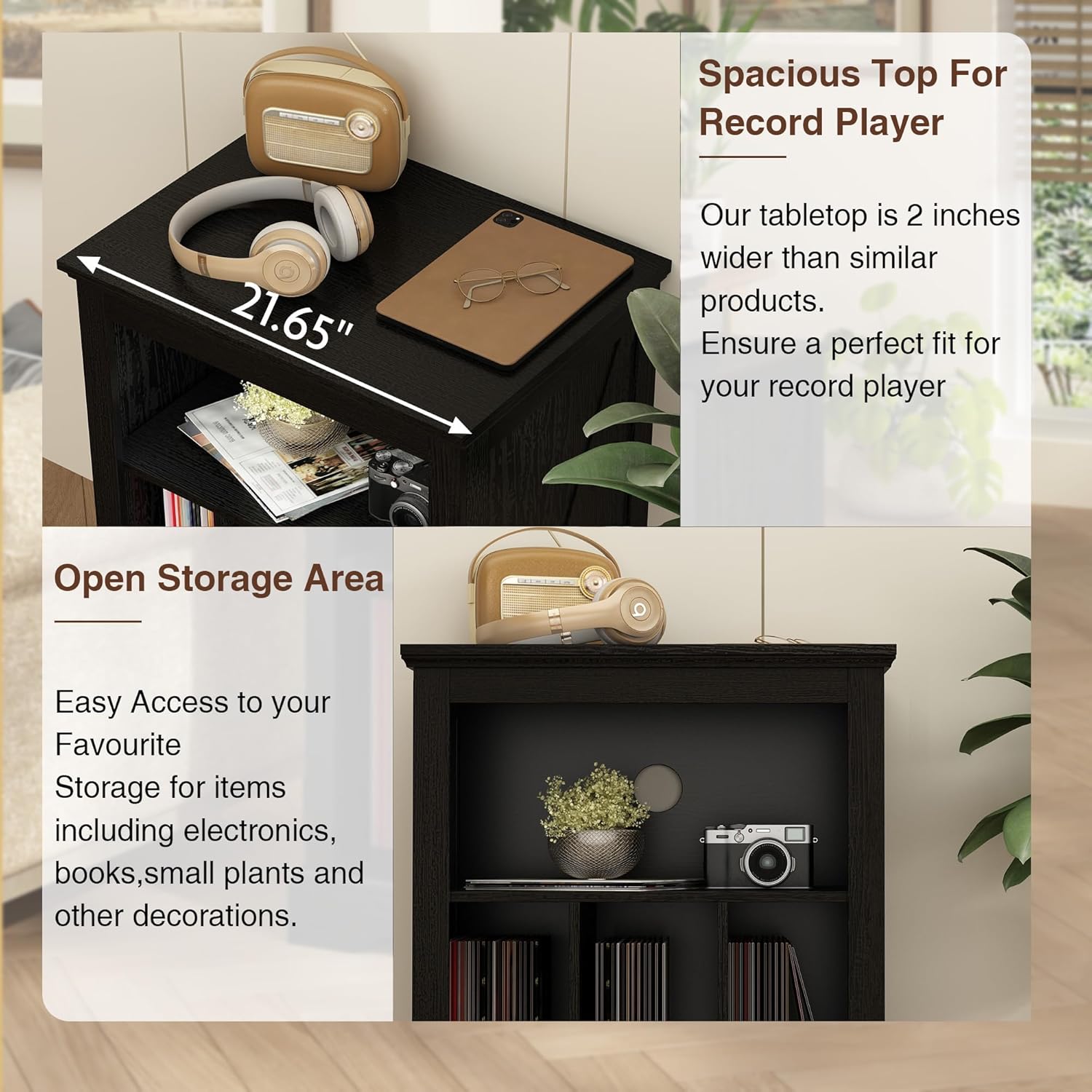 - Ample Storage: The spacious top is 2 inches wider than similar products,which is easily accommodates various sizes of record players, meeting the needs of most vinyl enthusiasts.Whether it’s for a snacks,decorative items or extra audio equipment, the spacious second shelf of this record holder is ready for daily use. Perfect for those moments when you need a bit more space. Plus, this record player stand with vinyl storage can also serve as a small table stand or printer stand, making it a versatile addition to any room.