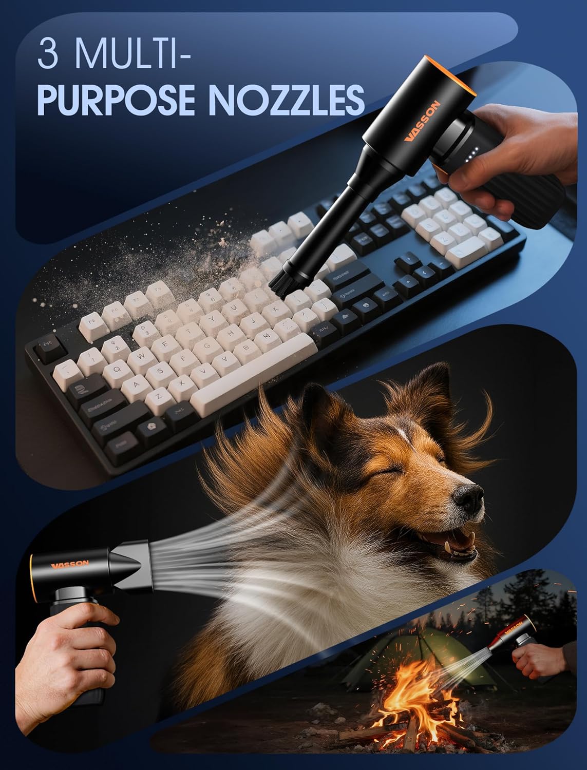 - Multi-Functional Cleaning Tool: The air duster comes with 5 nozzles, 1 brush, and a storage bag. It’s suitable for cleaning keyboards, computer towers, car mirrors, vents, sofa crumbs, and more. Beyond cleaning, this versatile electric air duster can inflate, blow snow, start a barbecue, or even act as a mini cooling fan.