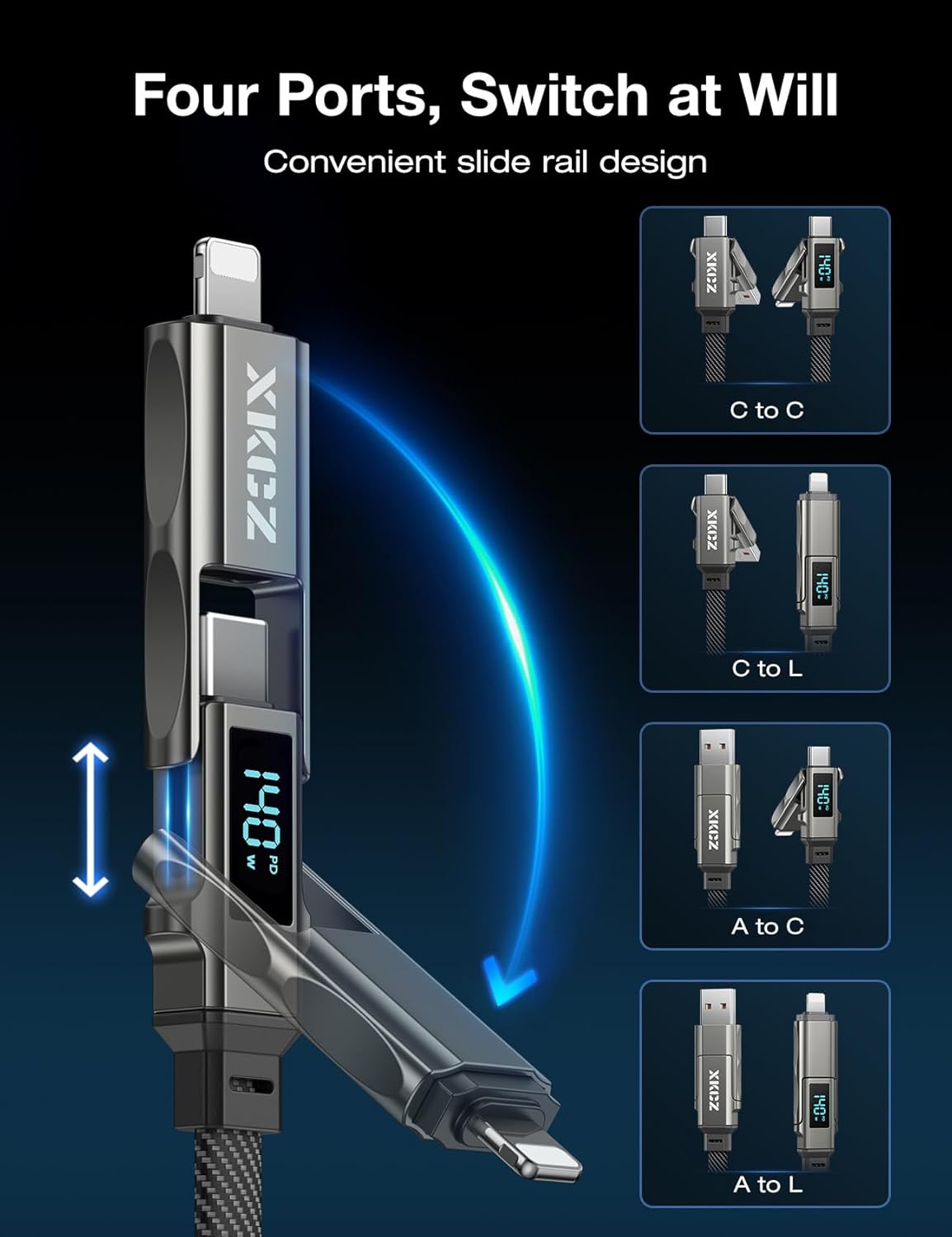 - [4-in-1 Versatile Cable] XKCZ Fast Charging Cable is designed to simplify your life. It has four ports, from MacBooks to iPhone,iPad and Android devices. whether you are at home, in the office, traveling, or even in a car. This universal 4 in 1 charging cable meets your charging or data transfer needs anytime, anywhere