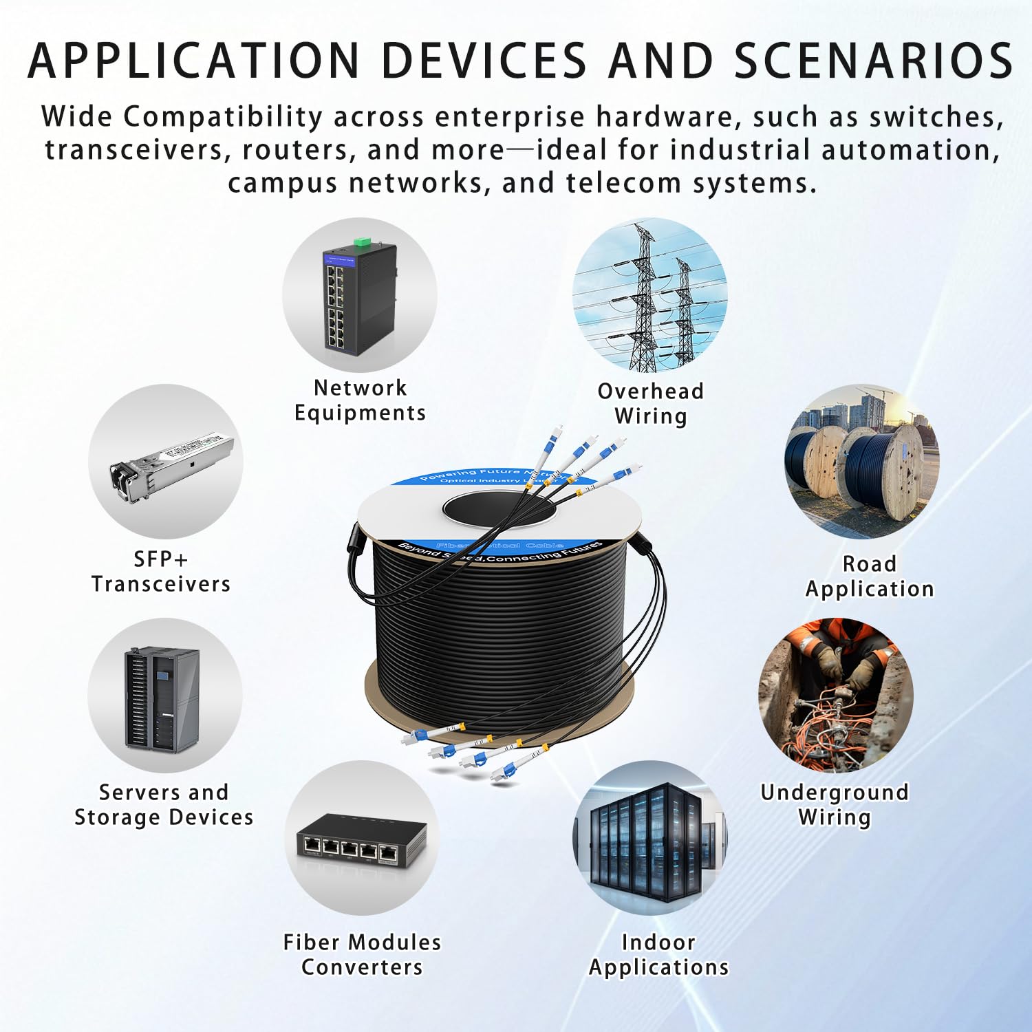 - 3.Plug-and-Play Simplicity: Factory-terminated and fully tested, this armored fiber cable requires no splicing. Simply plug into switches, patch panels, SFP/SFP+, XFP, QSFP+ transceivers, fiber NICs, media converters, ONU/OLT ports, or network testers for fast deployment in field projects or telecom rollouts.