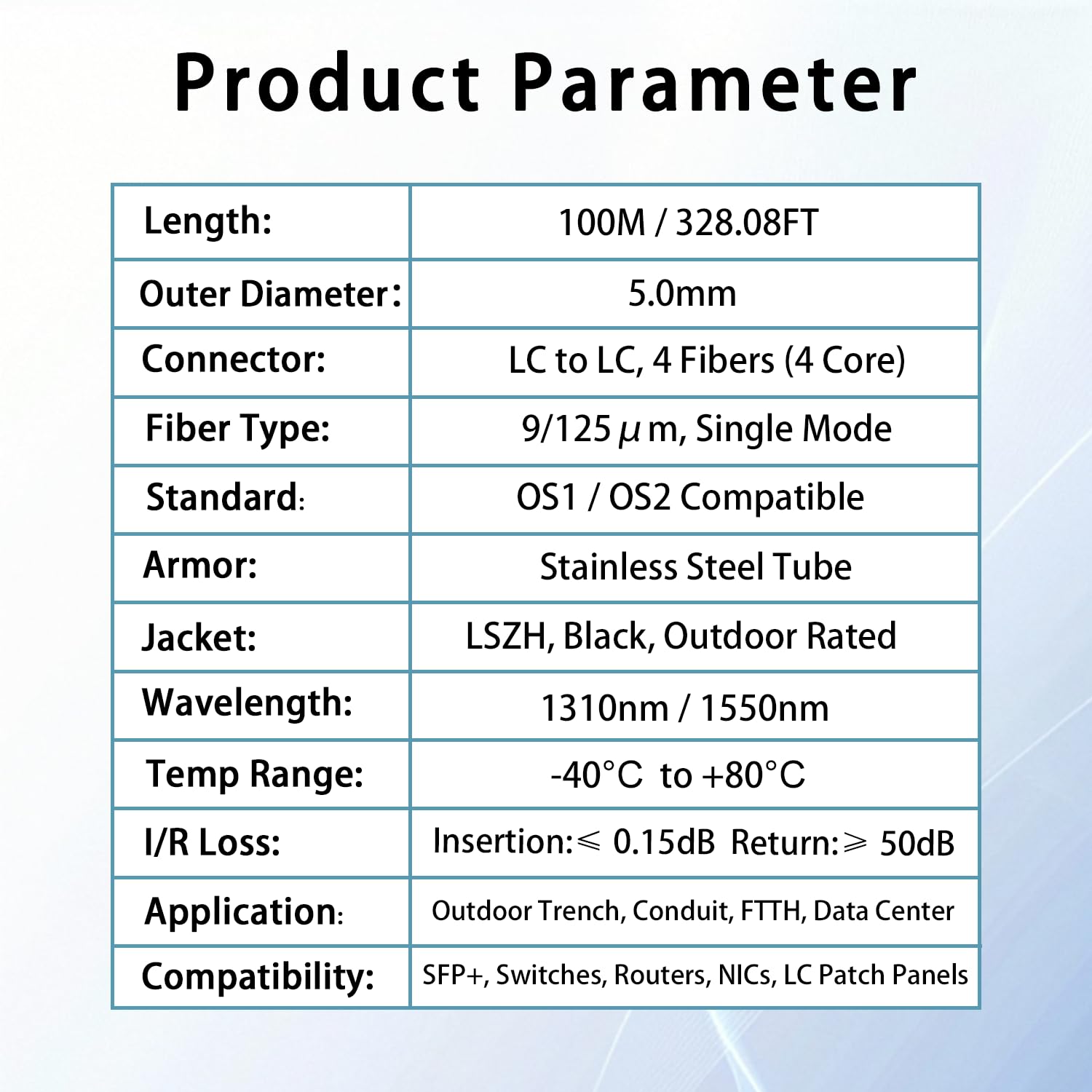 100M/328FT Outdoor Armored LC to LC Fiber Optic Cable, 4 Core OS2 Single Mode 9/125μm, Industrial TPU Jacket, OD 5mm, 4 Strands, SMF, Direct Burial, Heavy-Duty LC-LC Patch Cord for Harsh Environments
