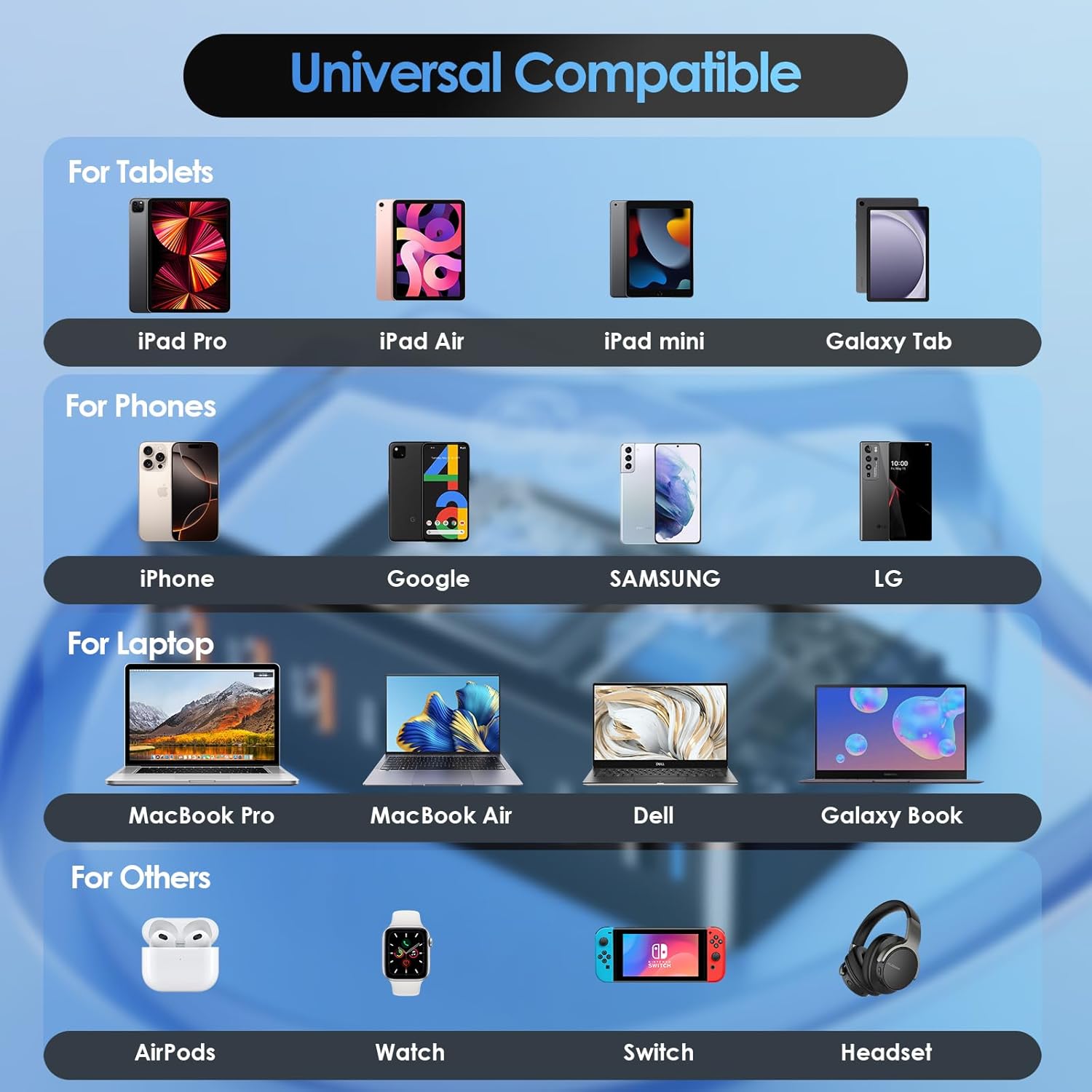 - Compatible Devices : MP3 Players, Headphones, Laptops, Speakers, Smartwatches, Kindle and Gaming Consoles with USB and USB C Ports MP3 Players, Headphones, Laptops, Speakers, Smartwatches, Kindle and Gaming Consoles with USB and USB C Ports