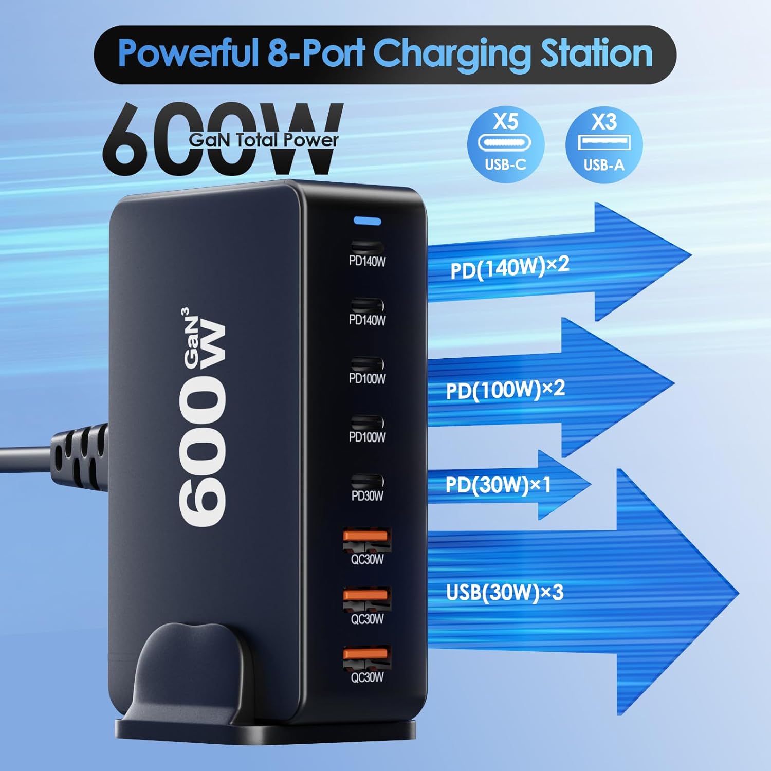 - [8-in-1 Charging Port Design] Equipped with 5 USB-C Power Delivery ports and 3 USB A ports. 2x140W USB C ports, 2x100W USB-C ports, 1x30W USB-C ports and 3x30W USB A QC ports, can provide high-speed charging for iPhone, ipad, laptop, watch, fan and other 8 devices at the same time. Extended power cord for easy charging. Simply purchase our multi port charging station to solve multiple charging needs at home/on the go.