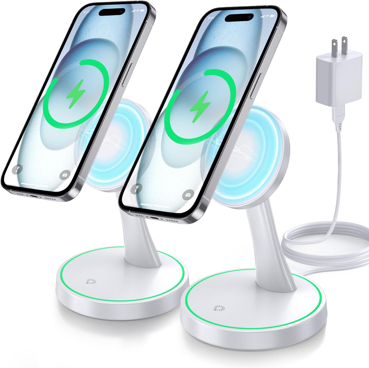 2 Pack Magnetic Wireless Charger Stand 15W Fast Mag-Safe Charger for iPhone 16/16 Pro/16 Plus/16 Pro Max/15/14/13/12 Series Magnet Wireless Charging Station/Pad with Sleep-Friendly Light for AirPods