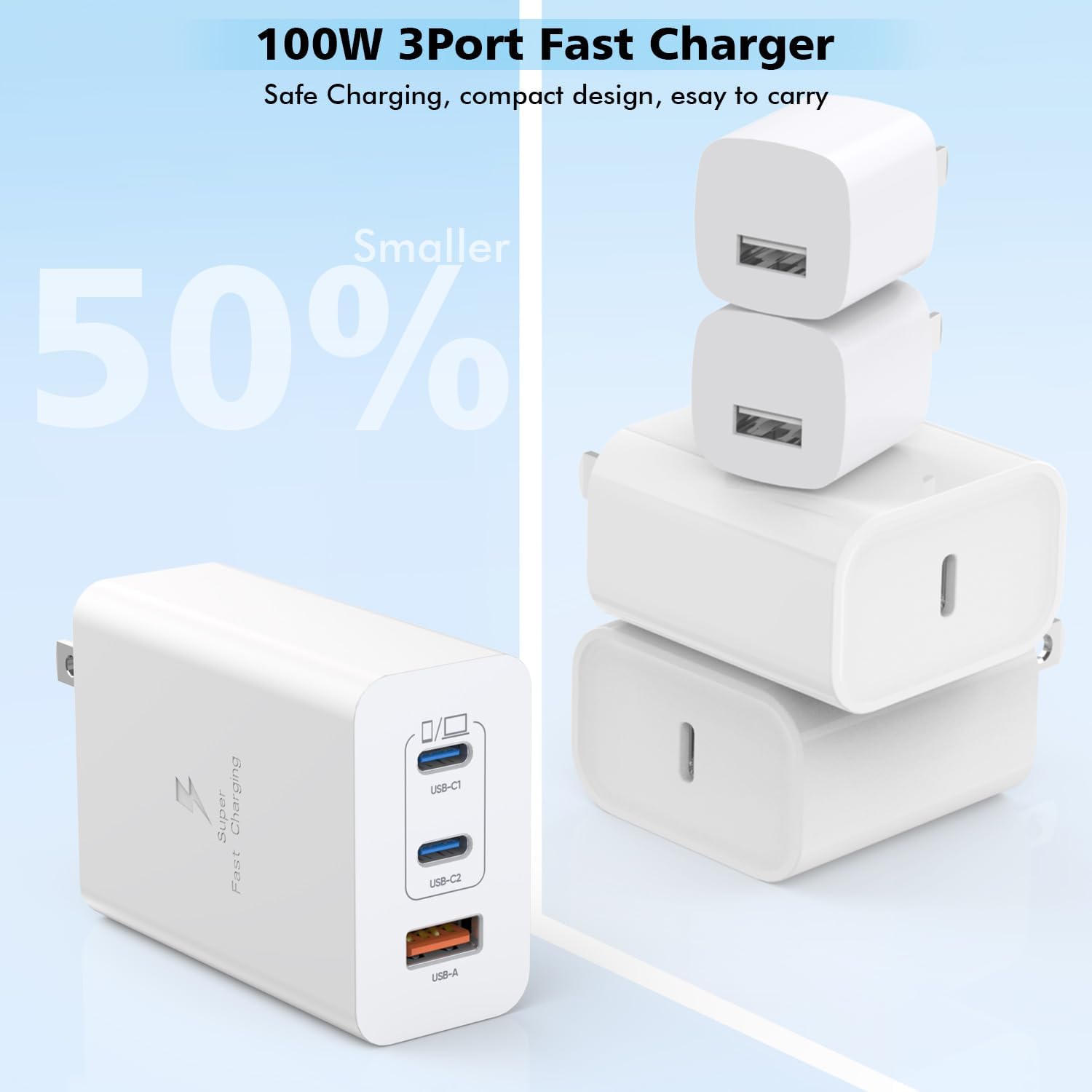 - [ 100W Multiport Fast Charging Block ] - 2PACK 3-Port USB C Macbook Pro Charger for iPhone 16/iPad Pro/Laptops. USB C Mac Charger is designed with 2x USB-C Port and 1x USB-A port, can charge 3 Devices Simultaneously at up to 100W. Mac Fast Charging Adapter will reduce your charging time and keeping you powered up and ready to go, no messy chargers with various interfaces
