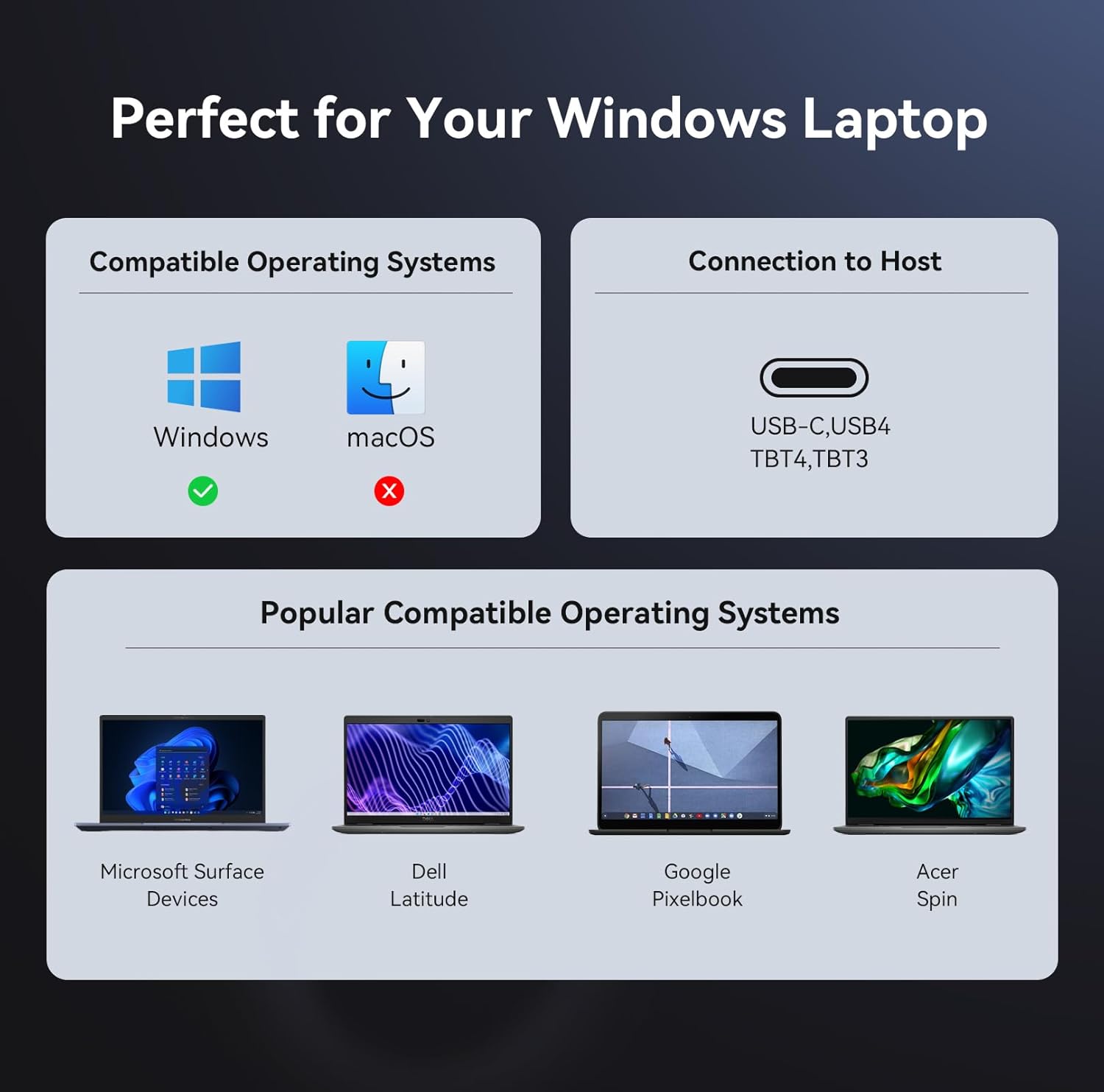 - Compatible Devices : Supports full-featured USB-C, USB4, and Thunderbolt 3 / Thunderbolt 4 systems running Windows 10 / 11 & ChromeOS 100 or newer including, HP ProBook / EliteBook / Spectre x360 series, Dell XPS / Latitude series, Lenovo ThinkPad / IdeaPad / Yoga , Microsoft Surface Pro / Go / Book / Laptop models, LG Gram, Thousands of other laptops which are compliant with full-featured, standards-compliant USB-C ports Supports full-featured USB-C, USB4, and Thunderbolt 3 / Thunderbolt 4 systems running Windows 10 / 11 & ChromeOS 100 or newer including, HP ProBook / EliteBook / Spectre x360 series, Dell XPS / Latitude series, Lenovo… See more