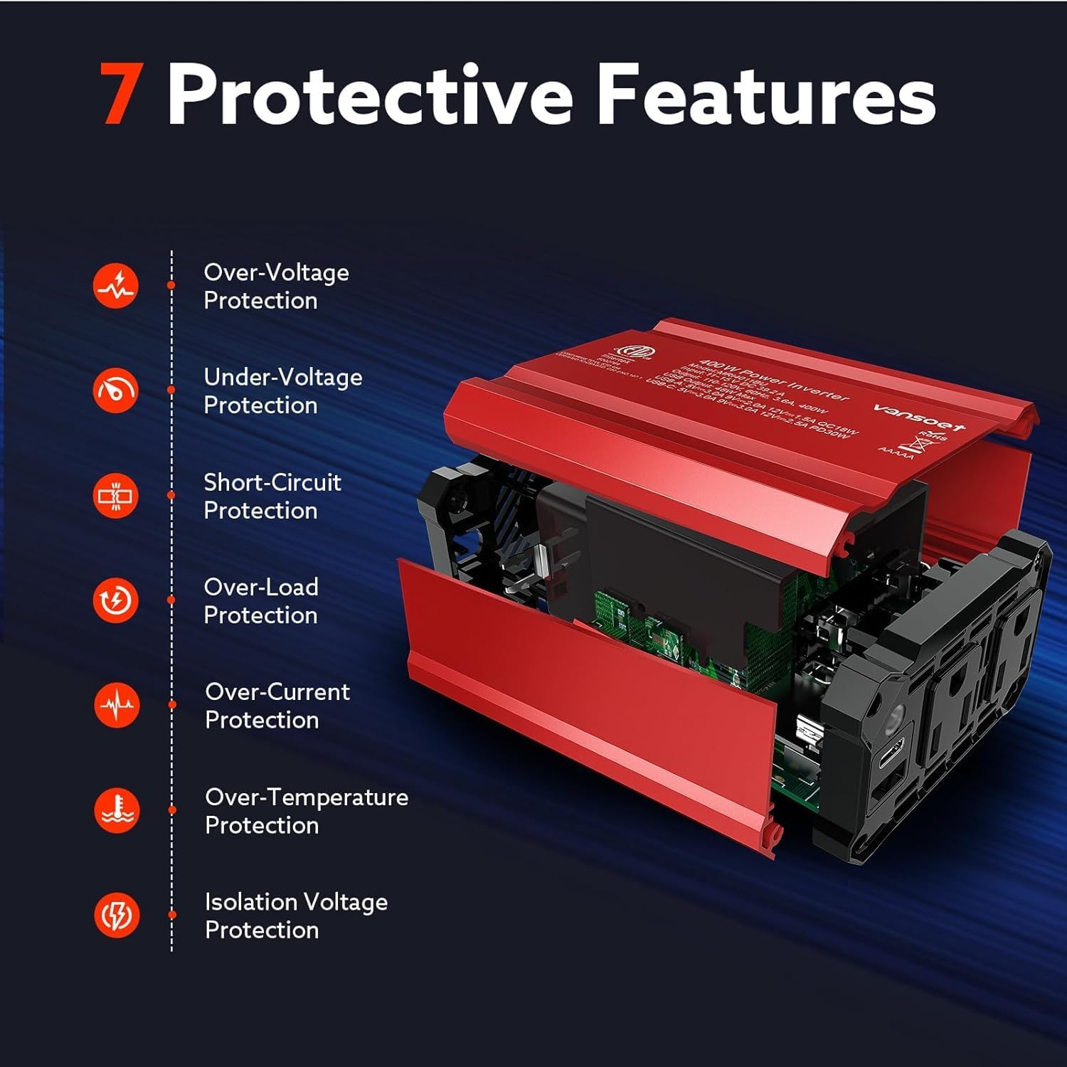 - vansoet 400W Car 12v Power Inverter : Provides 400 Watts continuous DC to AC power and 800 Watts instantaneous power, featuring dual AC outlets and 1 PD 30W USB-C port and 1 USB-A QC 18W port, which can fast charge iphone, ipad, macbook and other devices on the trip, and it can also power the air compressor, breast pump, CPAP machine, nebulizer, car vacuum cleaner and other devices.