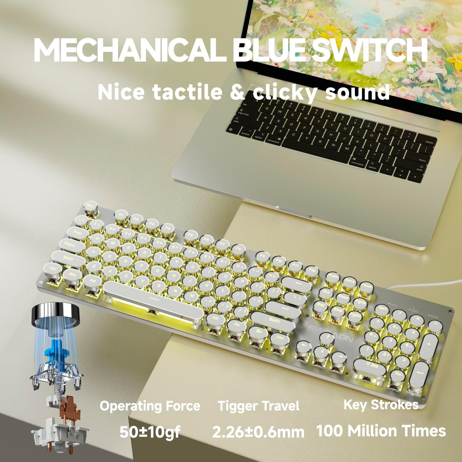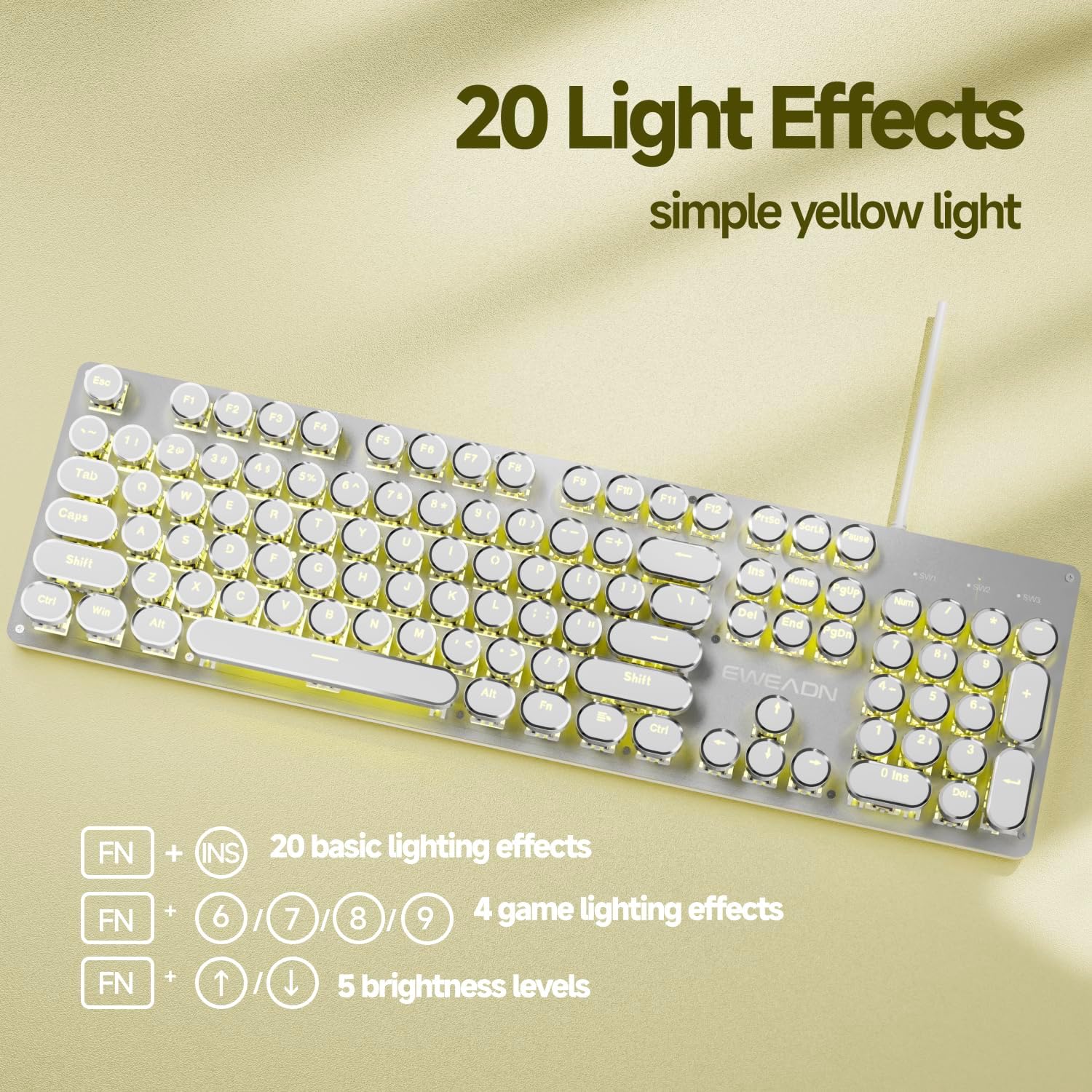 EWEADN TK100 Typewriter Style Wired Mechanical Keyboard, 104 Keys Aesthetic Typewriter Keyboard with Yellow Backlit, Anti-Ghosting, Blue Switch Cool Keyboards-White