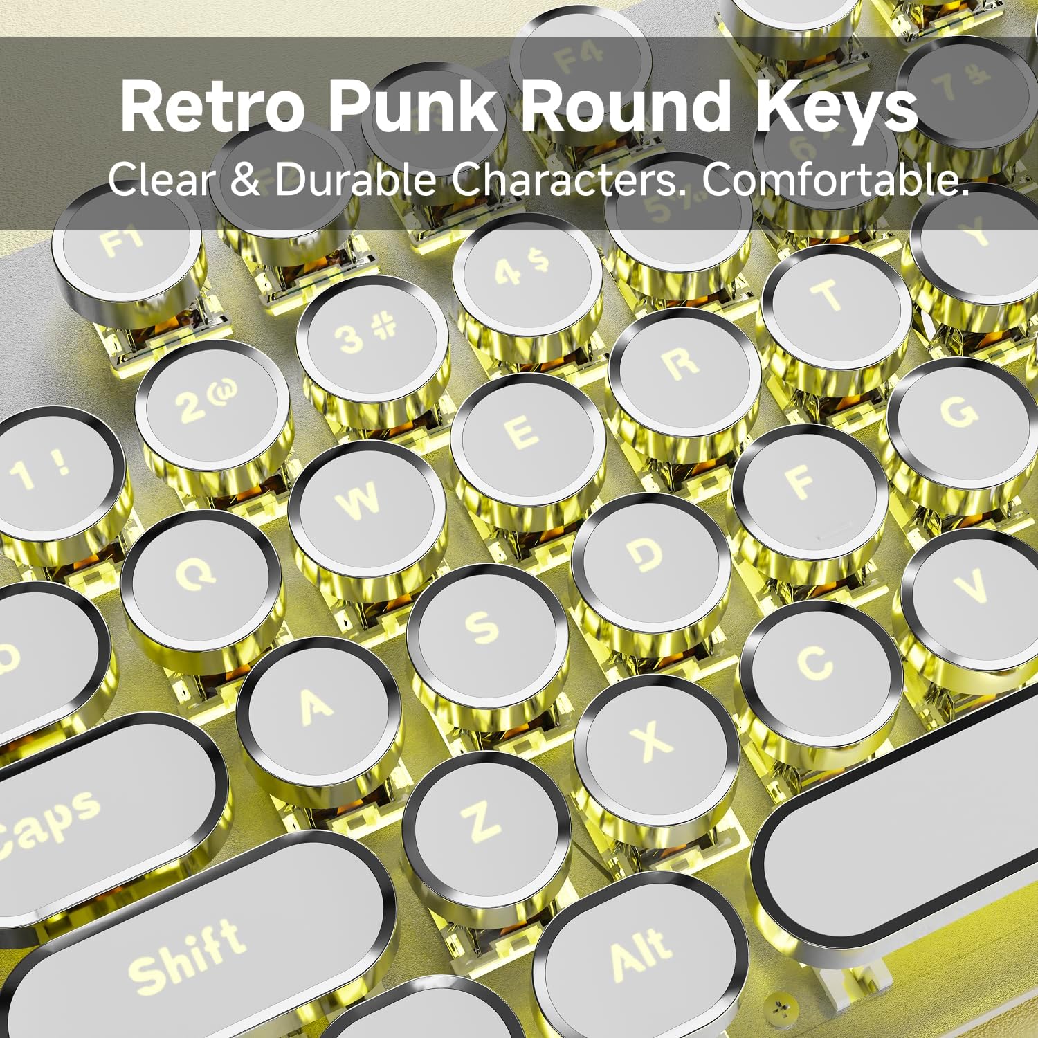 - Retro Typewriter Style Round Keycaps: The TK100 wired typewriter keyboard uses a double-shot injection retro punk round keycap with a clear backlight, which is extremely durable. Stepped floating keycaps that fit your fingertips perfectly, a precise position. Ergonomic foot support makes typing less tiring and more comfortable. The highly durable mechanical blue switch responds faster and more quickly, accompanied by a crisp click