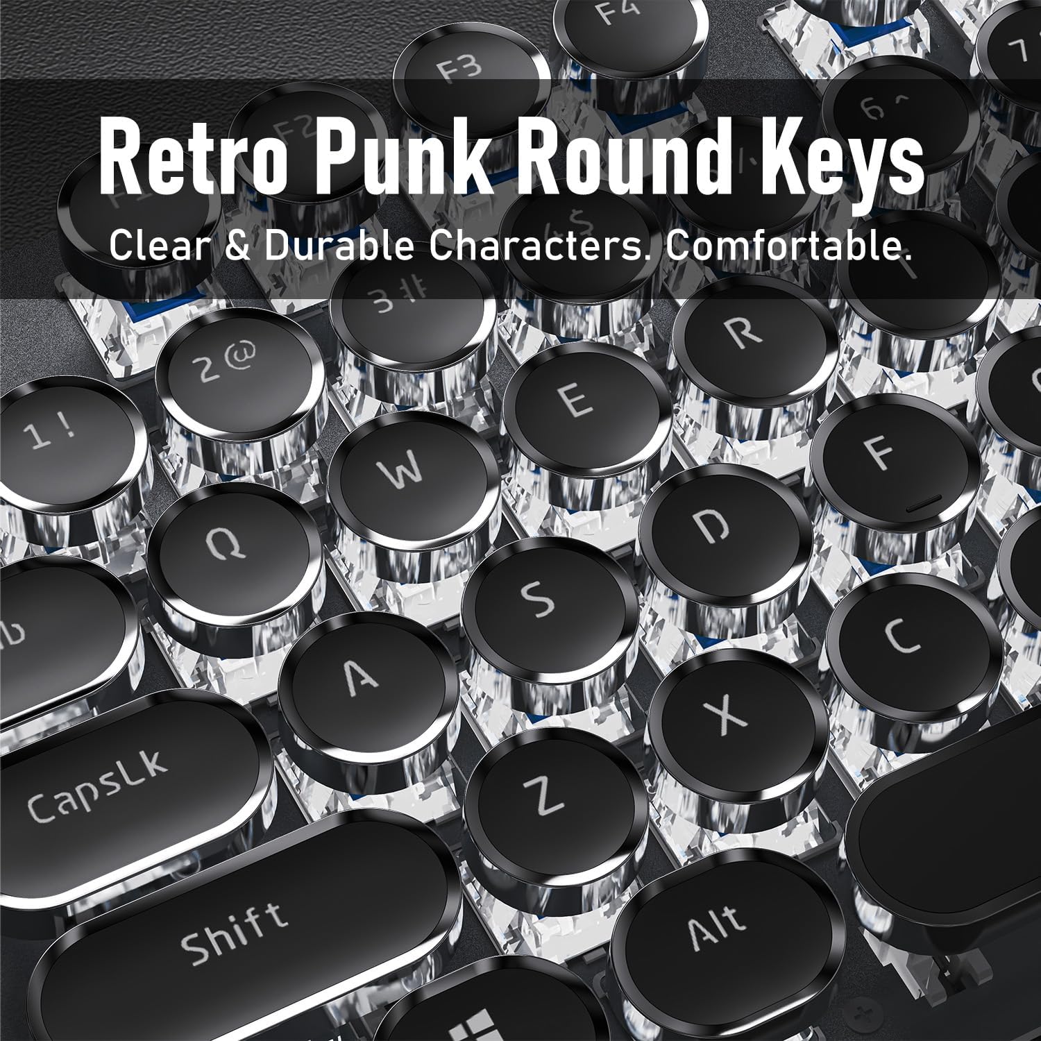 - Retro Typewriter Style Round Keycaps: The TK100 wired typewriter keyboard uses a double-shot injection retro punk round keycap with a clear backlight, which is extremely durable. Stepped floating keycaps that fit your fingertips perfectly, a precise position. Ergonomic foot support makes typing less tiring and more comfortable. The highly durable mechanical blue switch responds faster and more quickly, accompanied by a crisp click