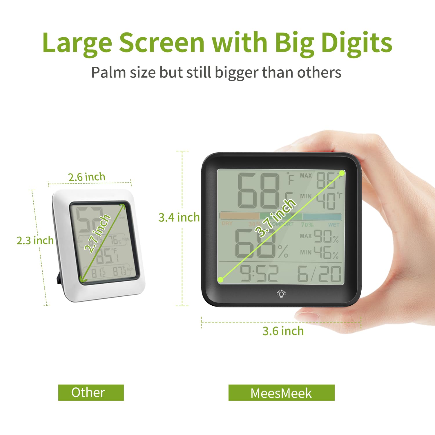 - Intuitive Display with Backlight - With a glance at the 3.7 inch LCD screen, you can see the current temperature, humidity, Max/Min Records, a 3-color 9-level air comfort indicator bar, clock time and date. Built in with a touch control 15 seconds backlight, you can easily check readings at night or in a dim room
