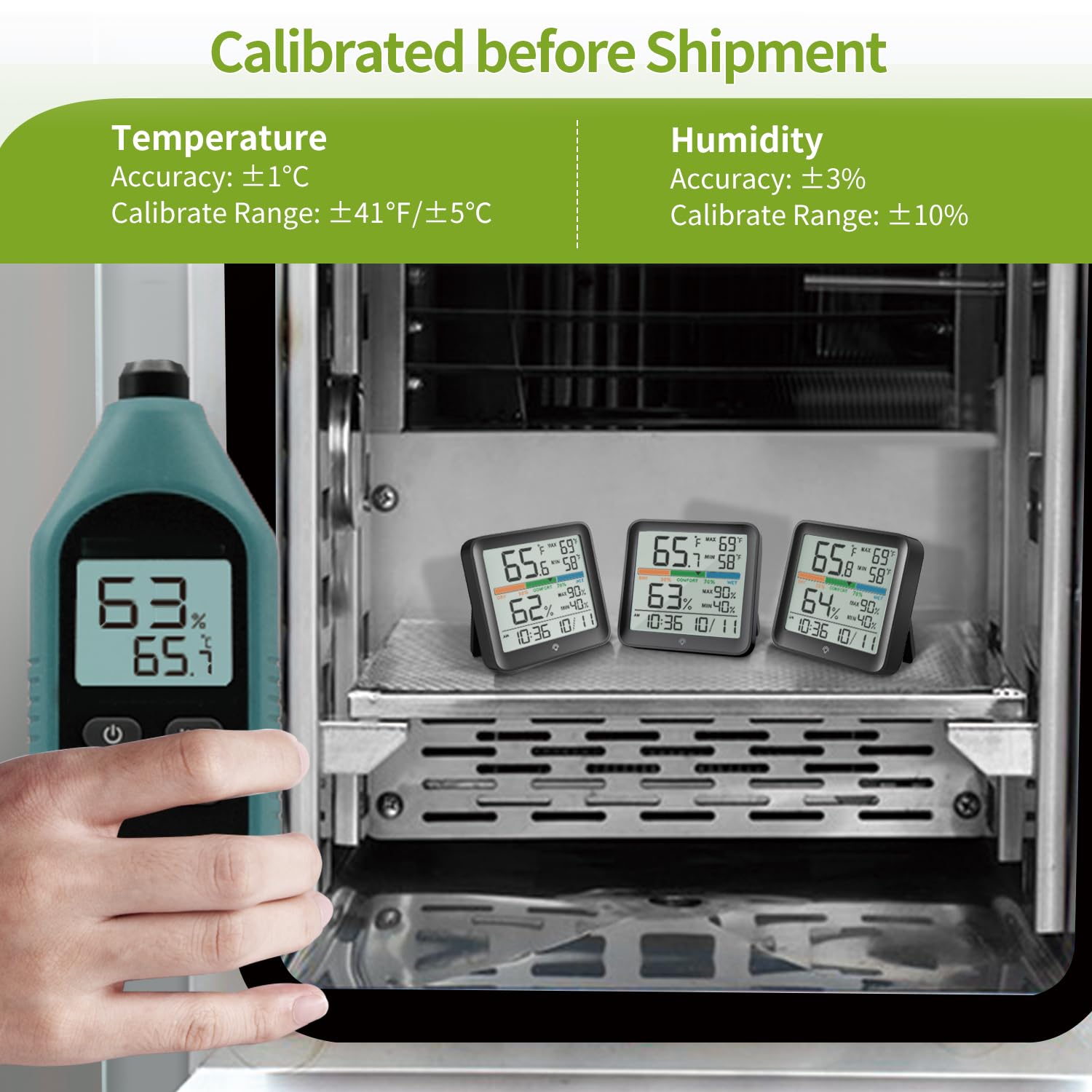 - Accurate with Calibration - MeesMeek thermometer and hygrometer combo device has built-in advanced sensors which is pre-calibrated at the factory with accuracy of +- 2 °F and +- 3% RH, and it also has a calibrate function that allows you to calibrate it at any time for more accurate and reliable readings