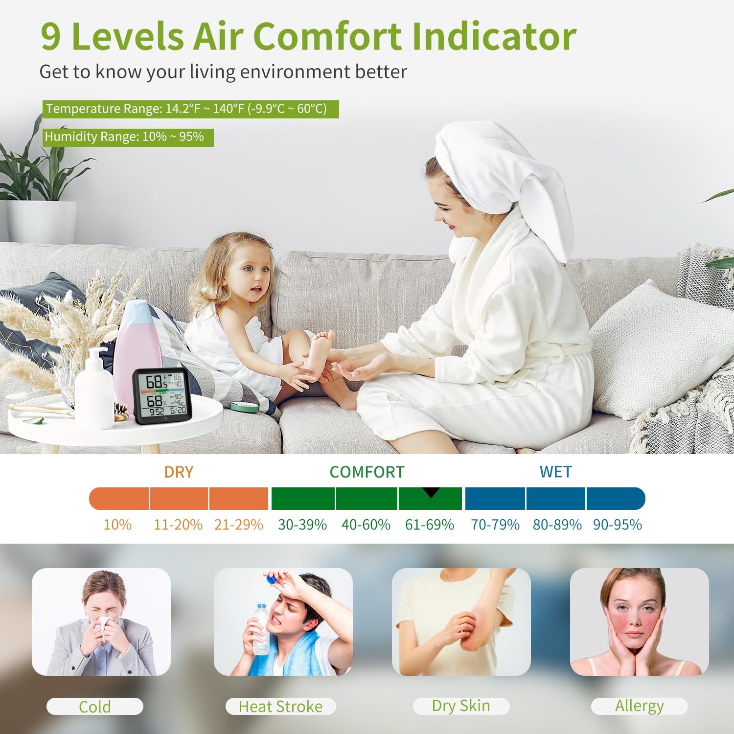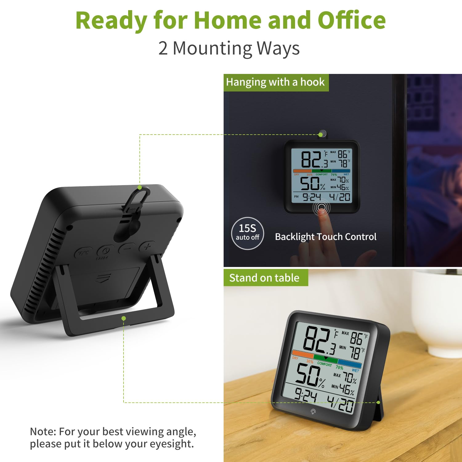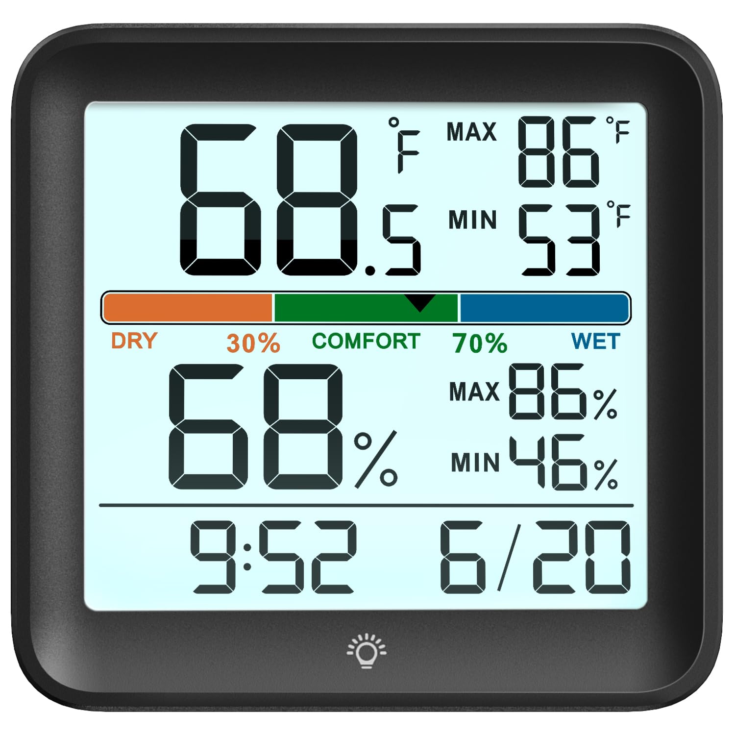 Indoor Thermometer Room Temperature Home Hygrometer Humidity Gauge, Accurate Calibration, Backlight, Air Comfort Indicator, Max Min Records, Time, Date (1, Black, 3.6" W x 3.4" H)