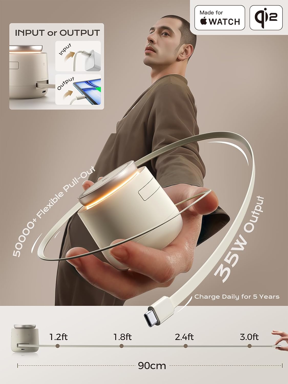 - ⚡【Additional 3FT Retractable Cord】Based on the traditional 3 in 1 charging dock, we have additionally designed a built-in 3ft retractable cable, it can be used for either input or output. When used as an input, it can be connected to an adapter to supply power to this charger cube. When used as an output, it can charge your fourth device, be it your iPad or Android device. It keeps you away from the hassle of tangled wires and truly serves as the ultimate solution for your wireless charging needs and it can be adjusted in several levels to meet different length needs. 50000+ pull-out test to ensure durability and safety, eliminating concerns about product longevity or structural integrity.
