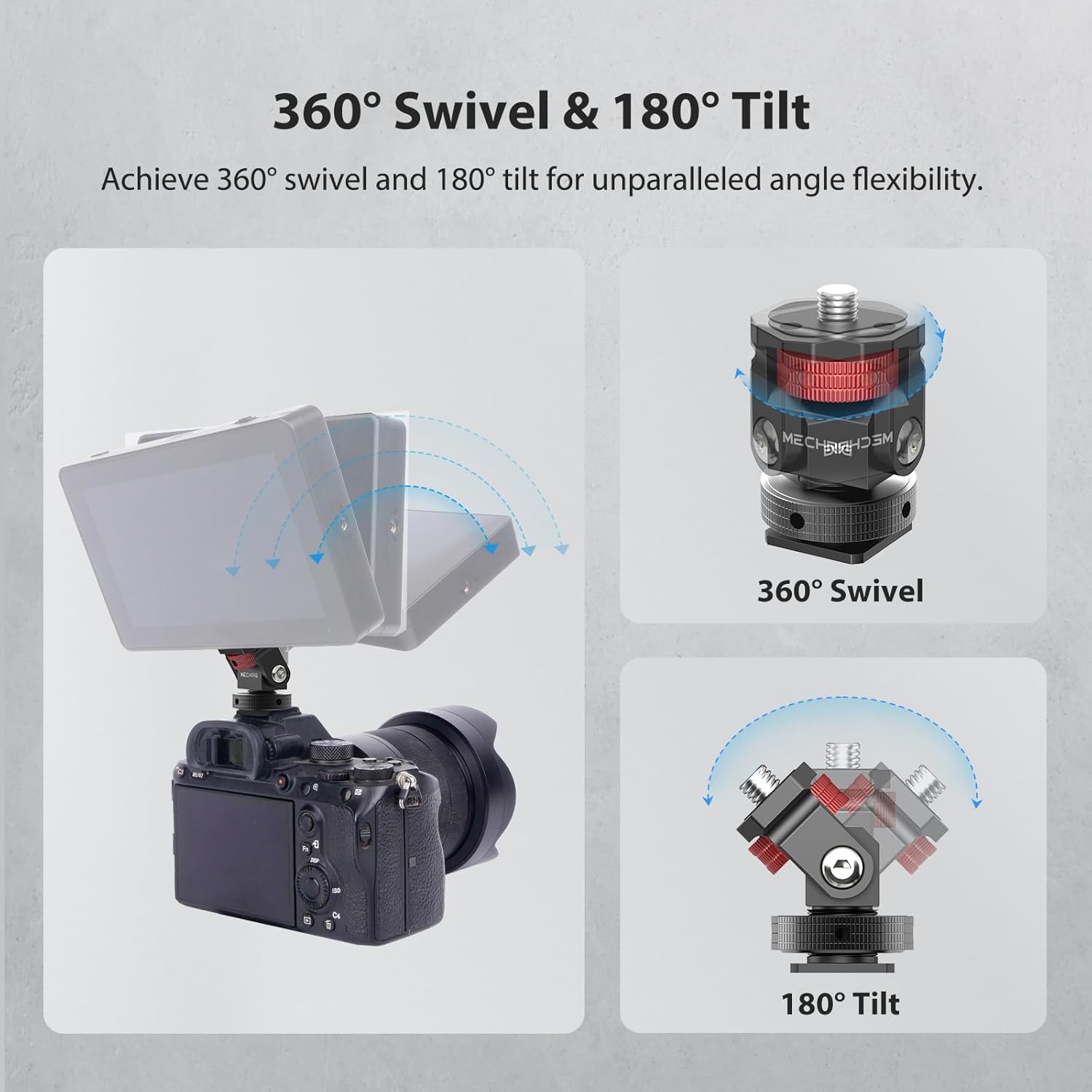 - Smooth Damping with 360° Swivel & 180° Tilt: Experience seamless positioning with the cold shoe mount’s 360° swivel and 180° tilt capabilities. This design ensures your monitor or accessory is always in the perfect position