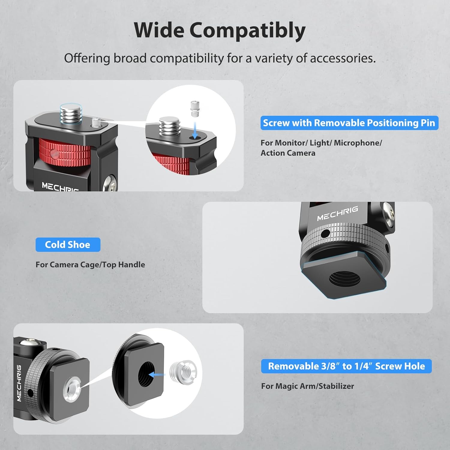 - Universal 1/4"-20 Thread for Multiple Accessories: The cold shoe mount is equipped with a 1/4"-20 screw at the top, supporting a wide range of accessories such as monitors, microphones, and LED lights. This versatile design ensures seamless integration with your existing gear