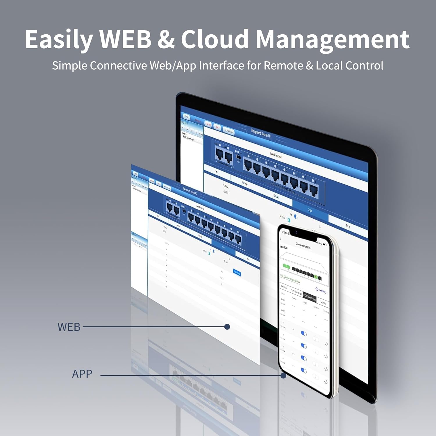 - [Cloud Managed Switch] This switch offers flexible management options: 1) Web Managed includs Local management via a fixed IP without internet connection or through a router with DHCP for IP assignment; 2) Free cloud management by downloading a secure app, allowing monitoring and management of the switch and connected devices on mobile phones, iPad, or laptops anytime, anywhere.