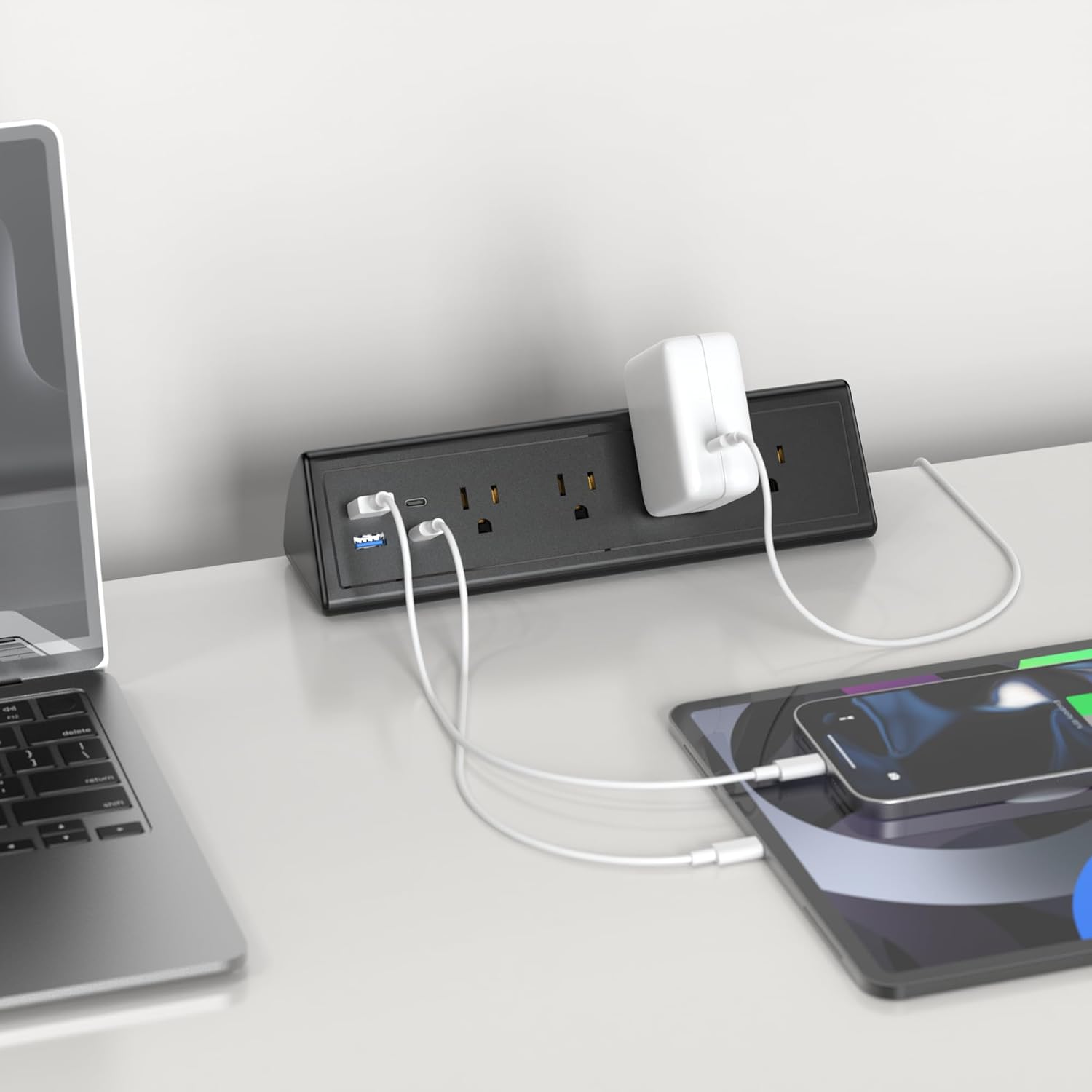 - Nightstand Edge Mount Power Strip: This edge-mount power strip features clamps that easily mount to desks, tabletops, and more for secure desk organization and a tidy workspace.