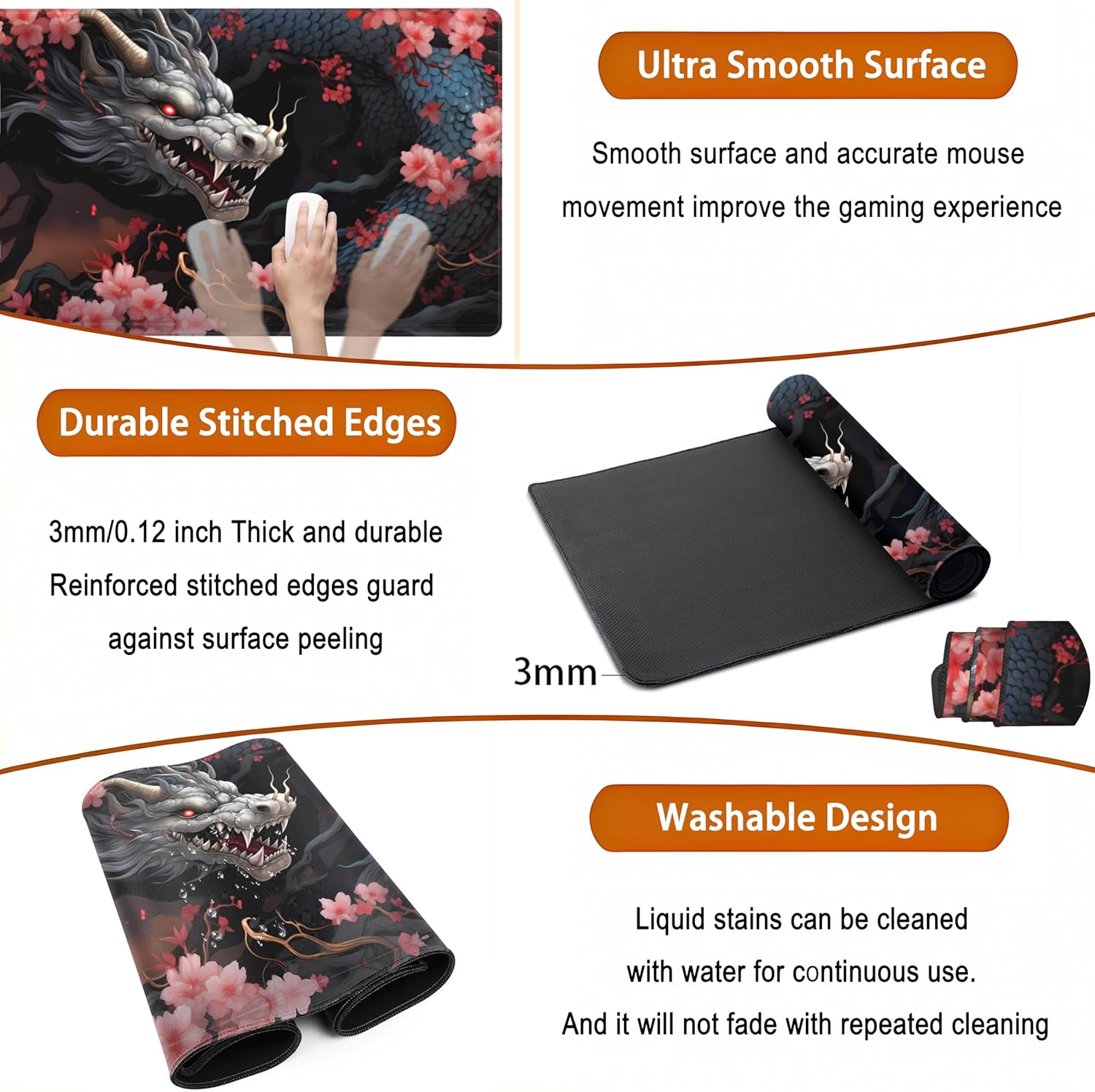 Cute Sakura Dragon Gaming Mouse Pad Kawaii XXL Large Extended Anime Desk Mat, Non-Slip Rubber Base Mousepad, Office Decor Desk Pad, Cool Keyboard and Mouse Mat with Stitched Edges, 31.5x15.75 in