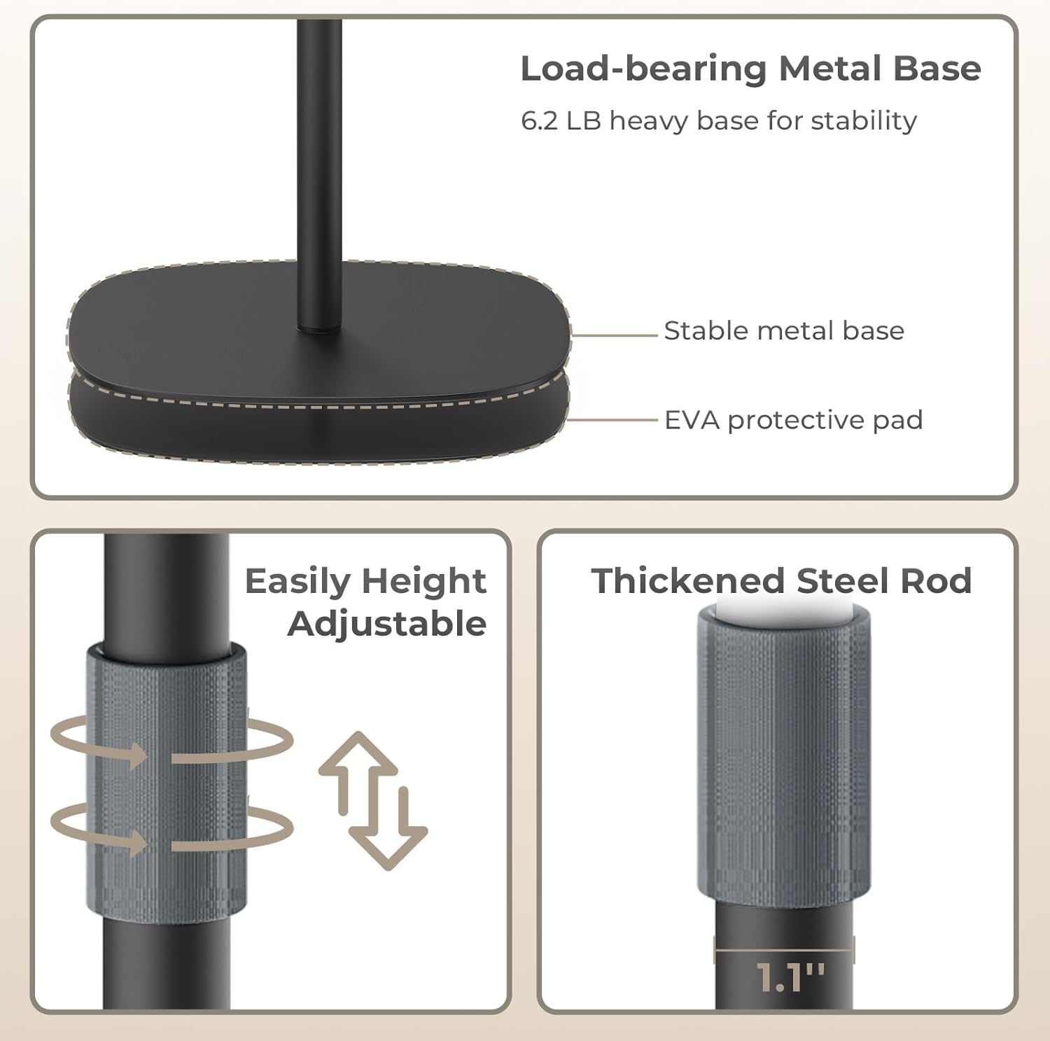 - 【Premium Construction】The sturdy metallic support rods and broad base provide unwavering stability, ensuring your device remains secure even during extended use. Complementing the durable metal frame is the beautifully finished wooden panel, crafted from medium-density wood with a natural grain pattern and smooth, tactile surface