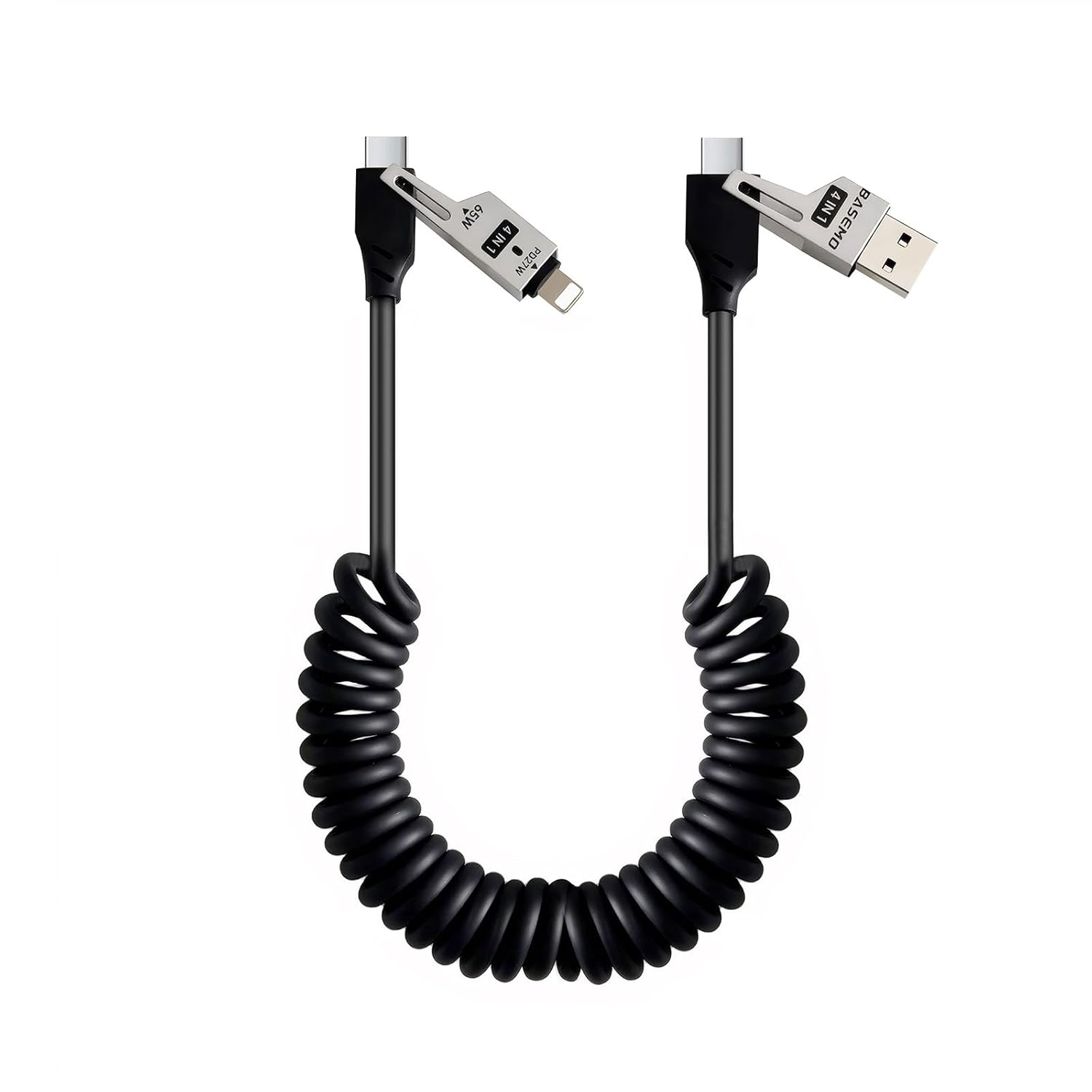 65W 4-in-1 Retractable Fast Charging Cable, 2M/6.5ft Spring Coiled USB-C to L/USB-C/USB-A Multi-Device Cord for iPhone 15/14/13, iPad, Samsung, MacBook, Laptop, Car, Tablet