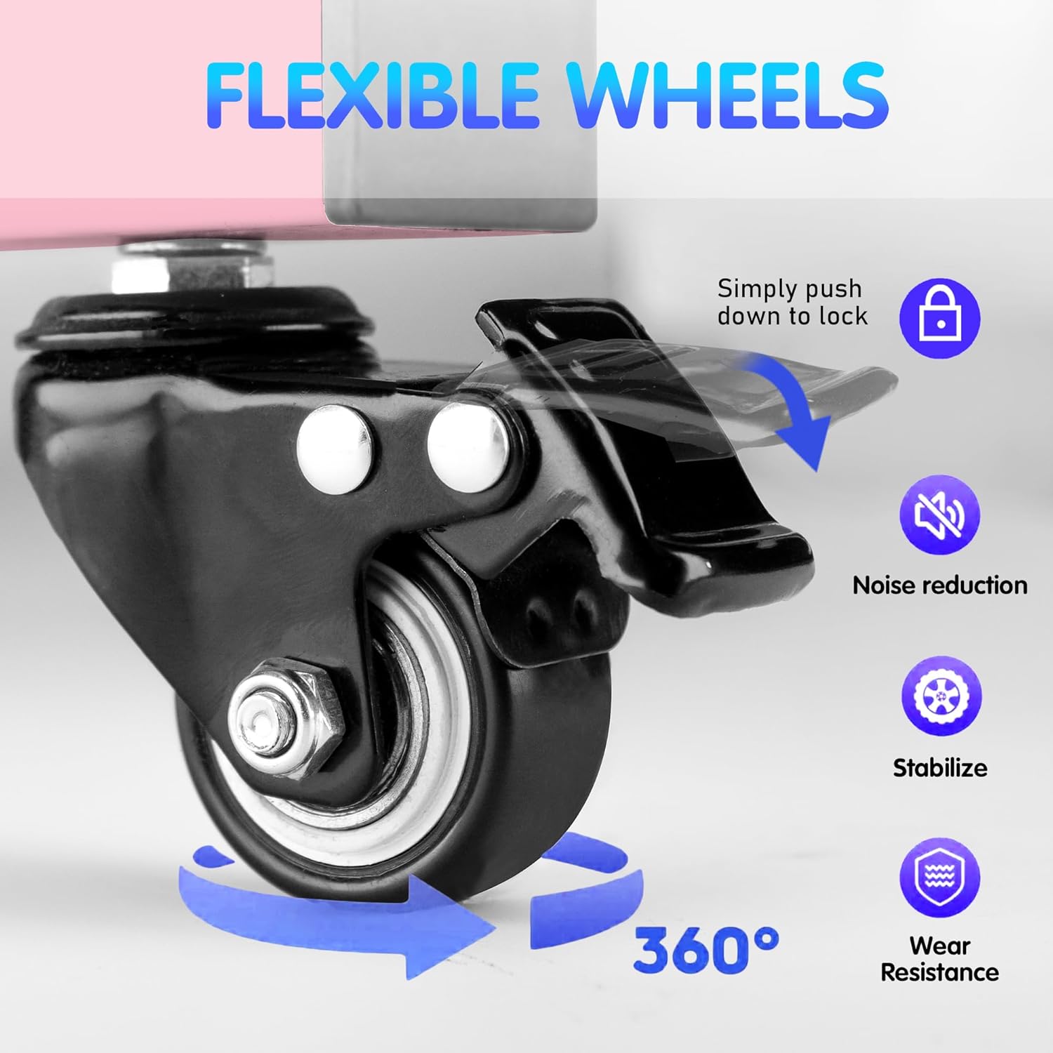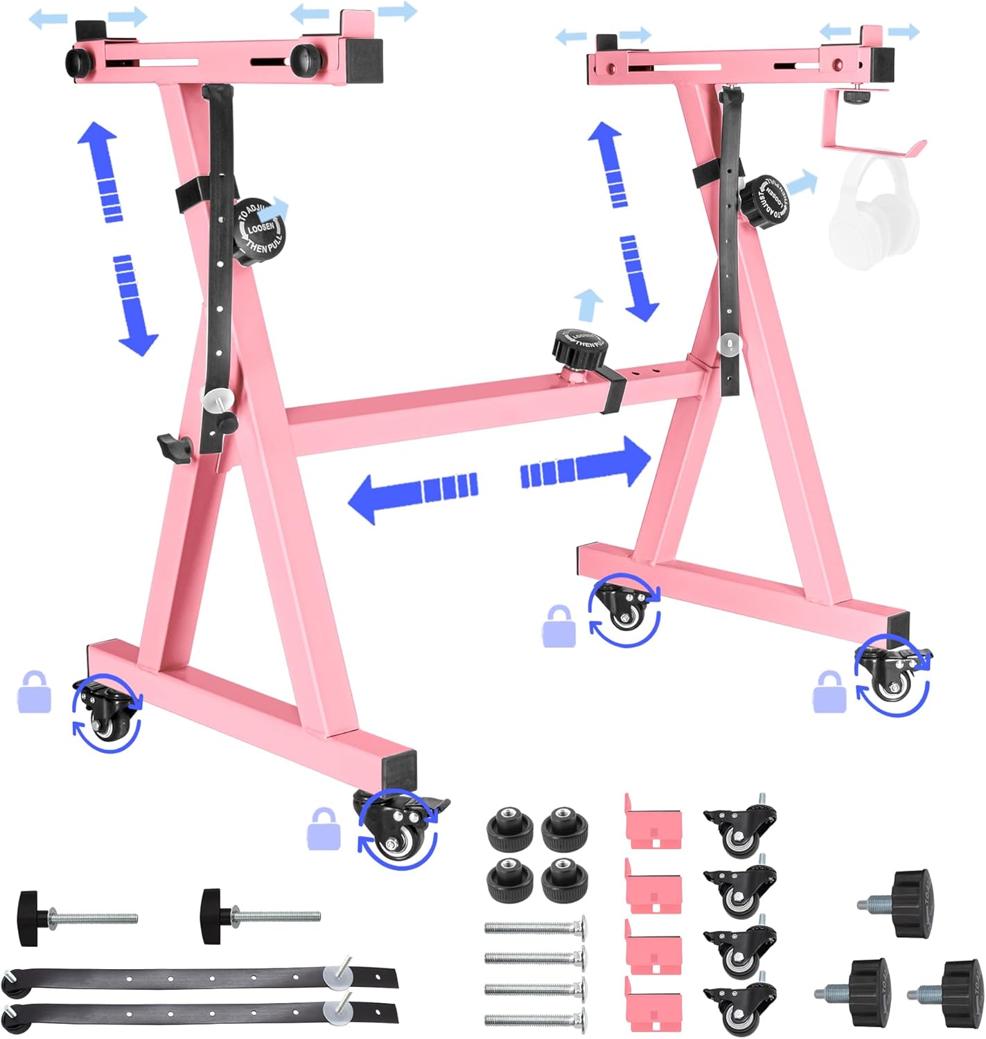 - Lockable universal wheels that allow you to move the stand anywhere easily.