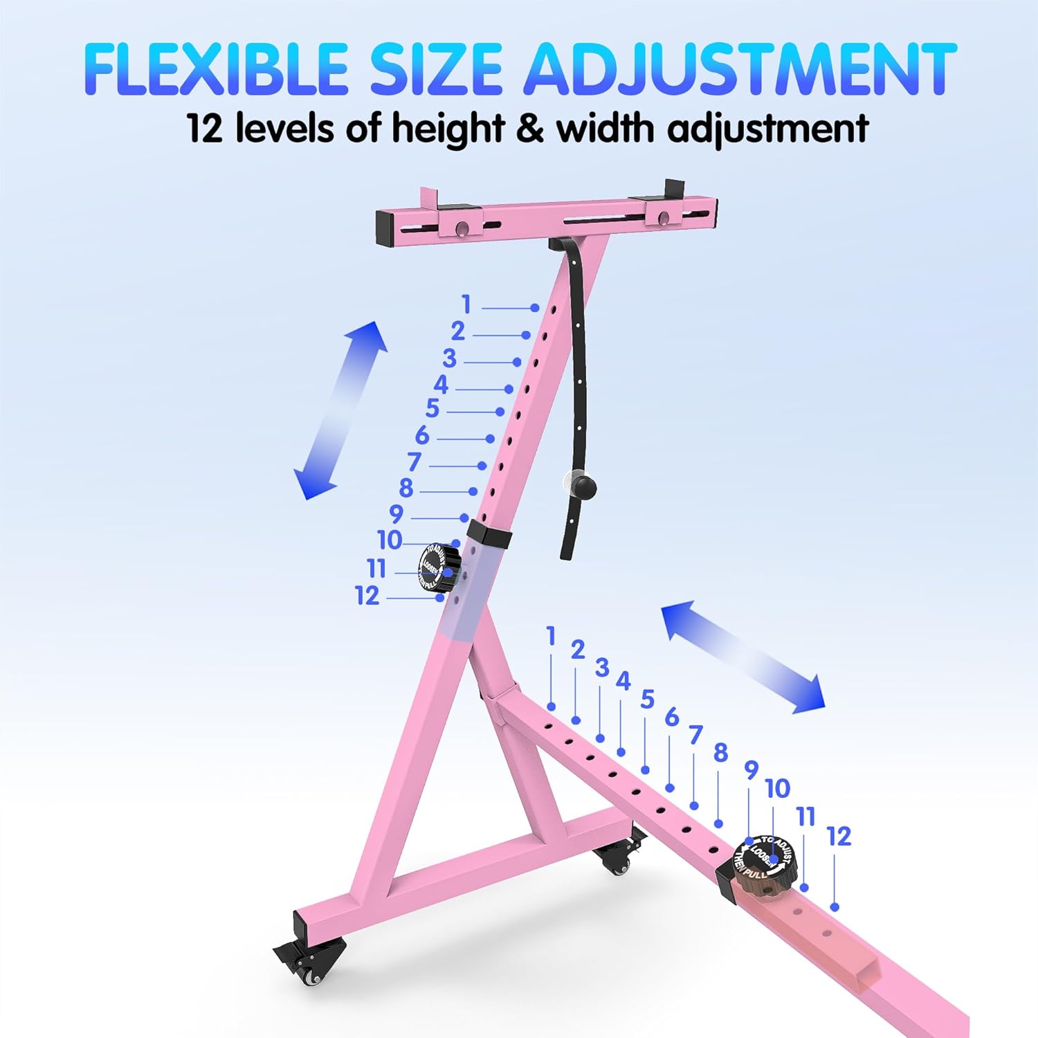 - The width adjustment has 12 gears, adjusted from 56cm to 94cm (22''-37''). The height adjustment has 12 gears (from 61cm-91cm (24''-35.8''))