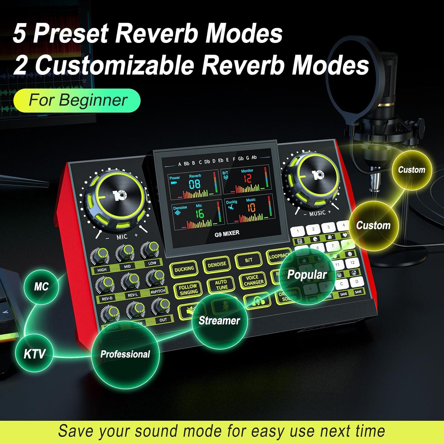 - 【Customizable Sound & Effects】Freely adjust bass, midrange, treble, and reverb settings. The G9 audio mixer for pc allows complete control to create your ideal sound for streams or podcasts.