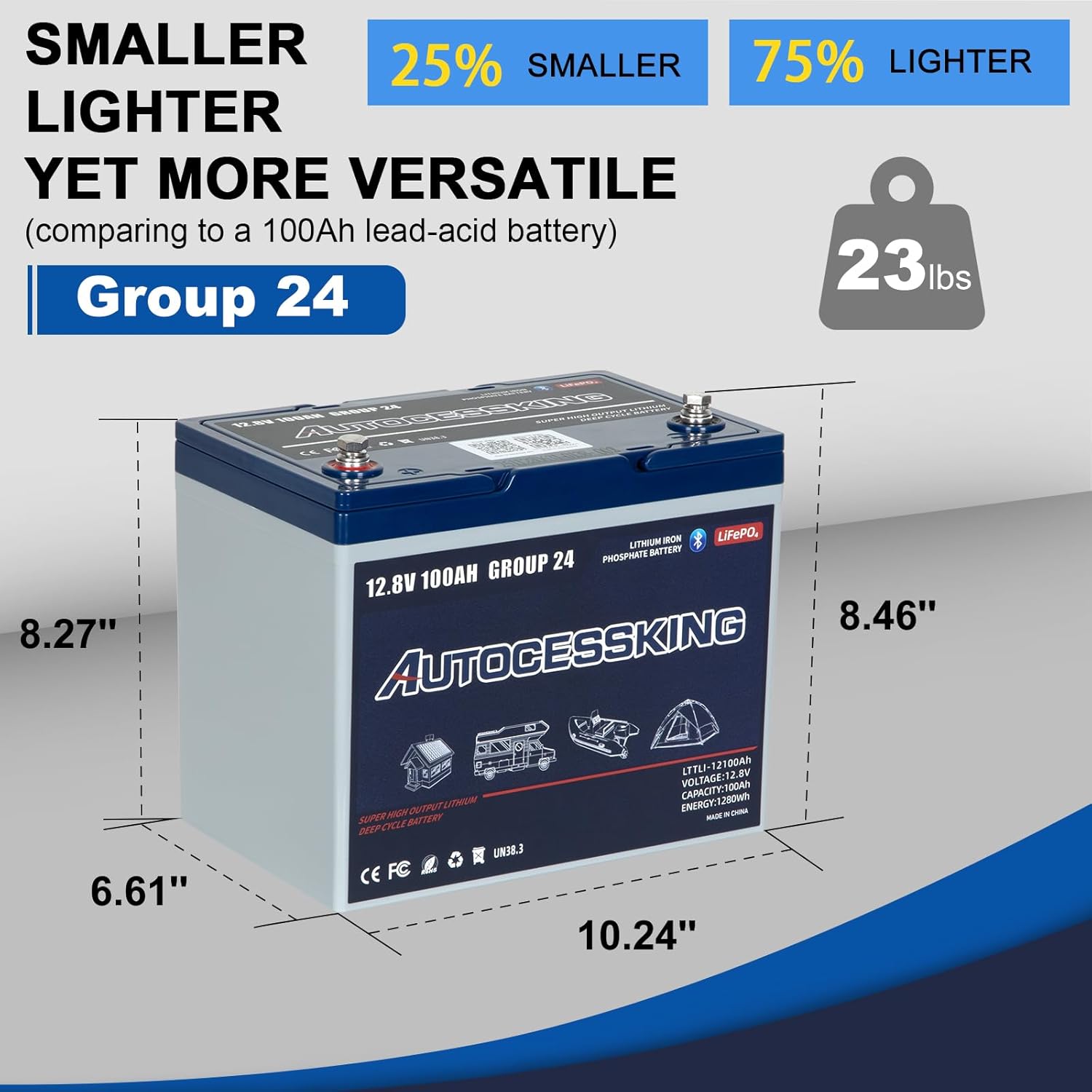 - ✅ LIGHTWEIGHT AND VERSATILE - Item Dimensions: 10.24"L x 6.62"W x 8.47"H. weight: 23.5lbs. Our 12v battery engineered with Lithium Iron Phosphate (LiFePO4) technology, all housed in a compact Group 24 size, offering 1/3 the weight, 2x power and 8x longer lifespan compare to a lead acid battery. It is a perfect upgrade for any 12V Deep Cycle battery. It offers 1.28kWh of energy and supports a maximum load of 1536W with a continuous discharge current of up to 120A (peak 500A for 3 seconds), making it ideal for trolling motors. The built-in Bluetooth functionality brings you enhanced convenience, you can monitor the battery anytime, anywhere.