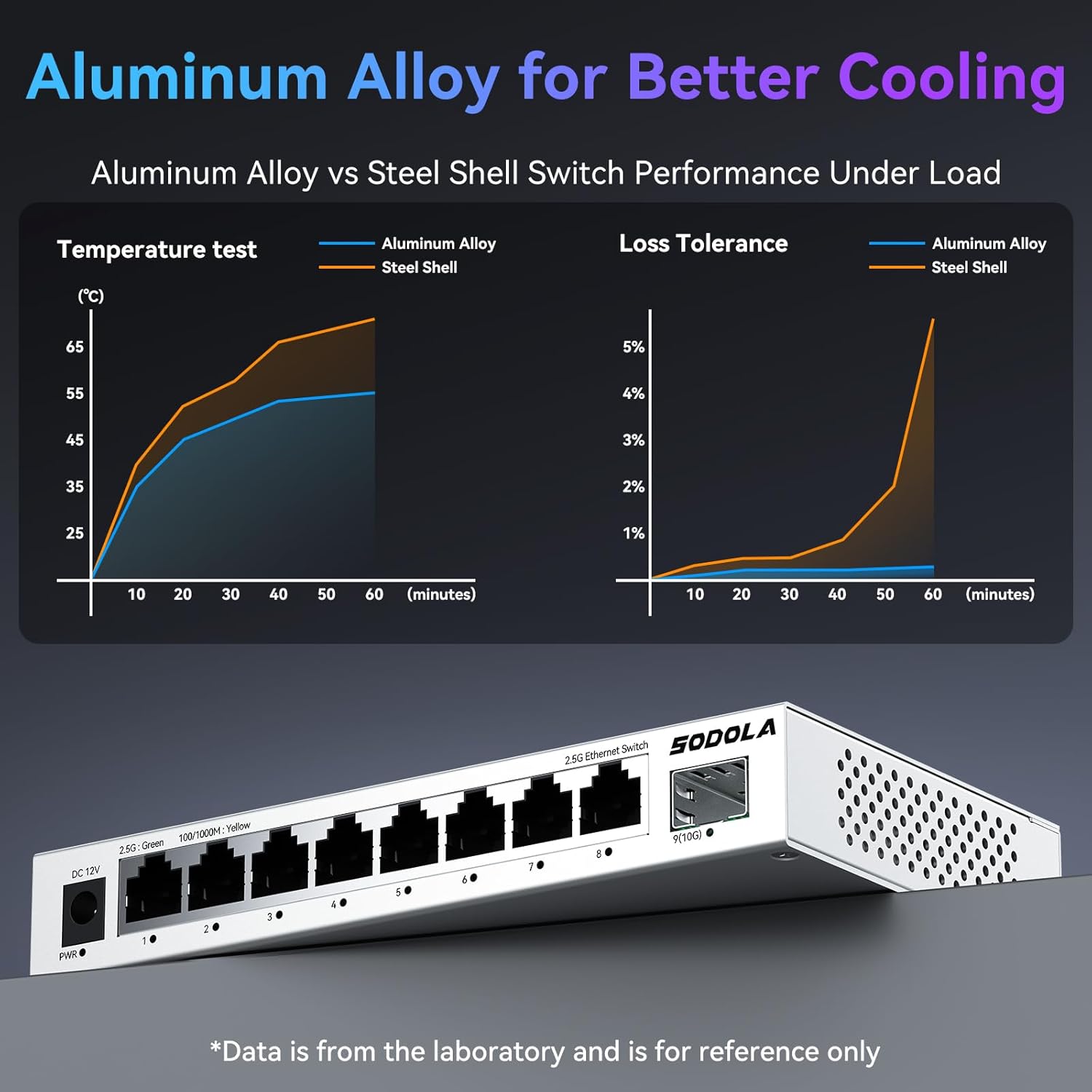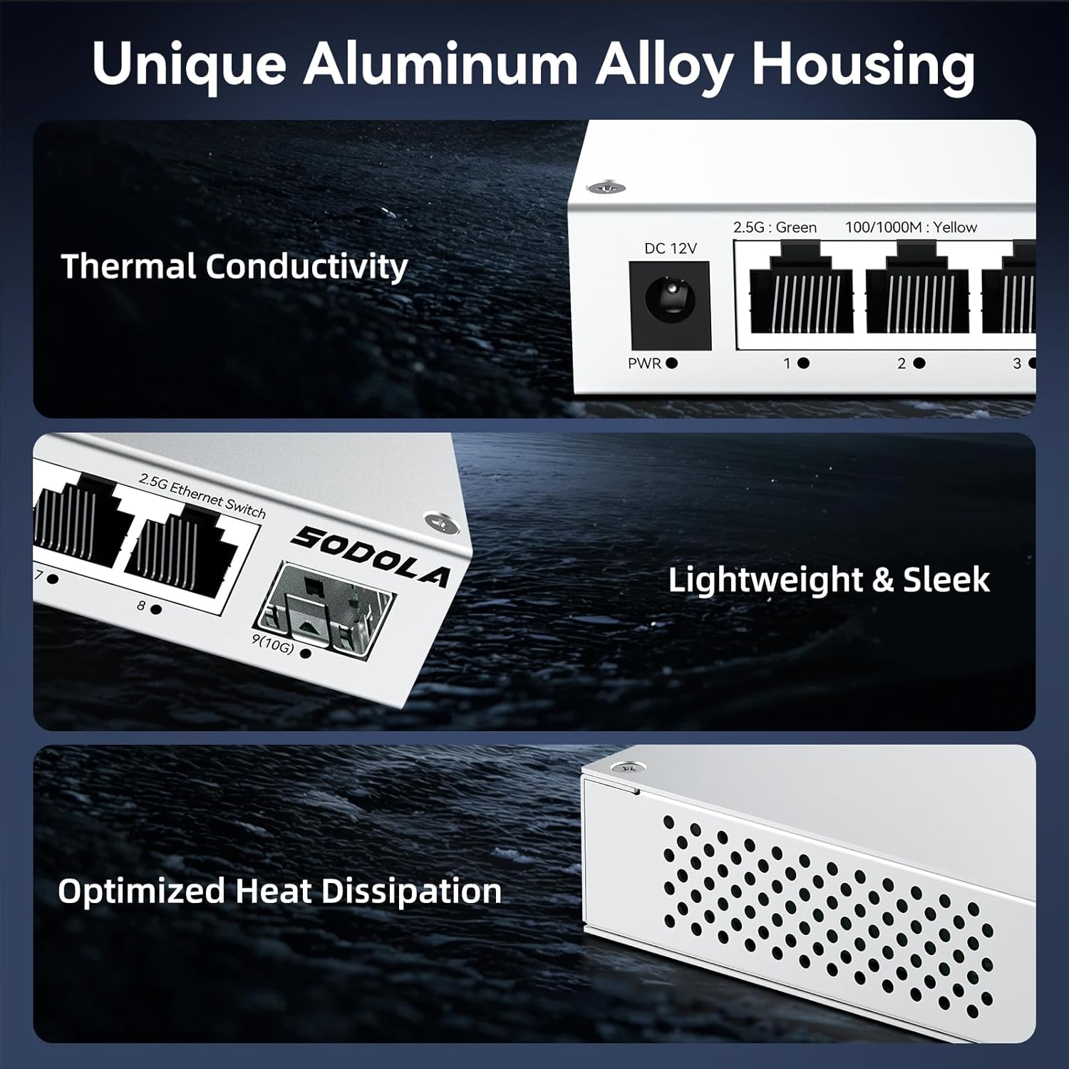 - 🌐2.5Gb Switch: SODOLA 9-port 2.5G unmanaged network switch provides 8x 2.5Gbase-T ports and 1x 10G SFP ports to provide fast and reliable network connections with 100Gbps Ethernet switching capability, ideal for bandwidth-heavy tasks like 4K streaming, NAS transfers, or low-latency gaming.
