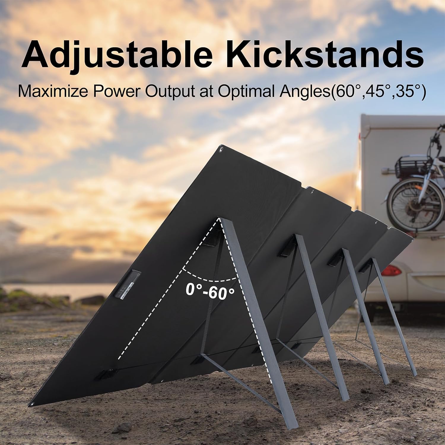 - 【Foldable & Portable Solar Panel】Designed for portability and convenience, the 410W solar panel features a lightweight, multifold design with a zippered accessory pouch. Once unfolded, 4 incorporated kickstands allow for easy positioning on any flat surface to give you instant charge from sunlight