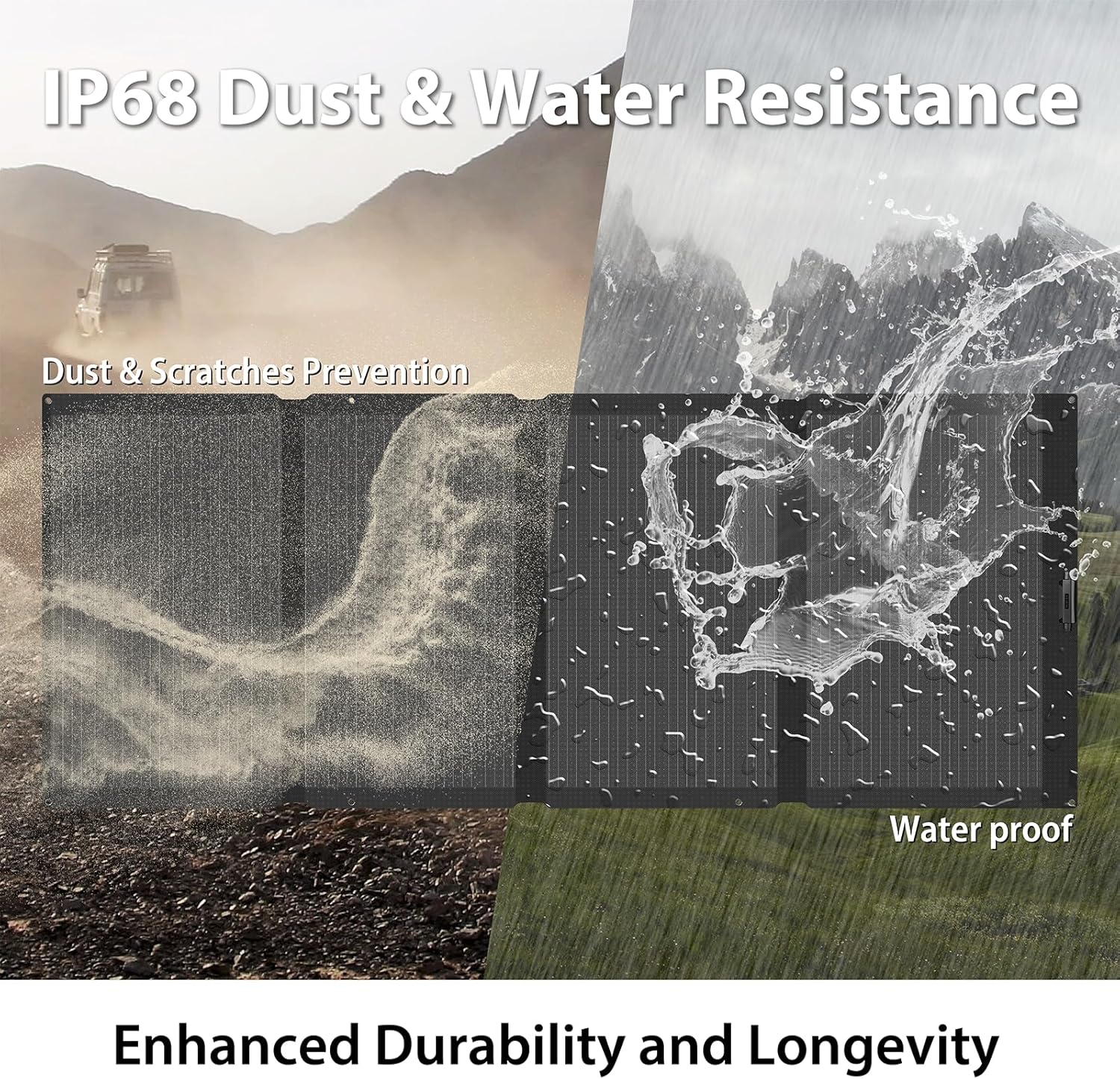 - 【IP68 Waterproof and Built to Last】Voominhtec folding solar panel features IP68 waterproof protection and a resilient ETFE coating that withstands all weather conditions, making it perfect for outdoor use in RV trip, camping and blackout. Reinforced with fiberglass, it offers exceptional durability and reliability. Designed for long-term performance.Note:Please do not submerge the solar panels portable in water
